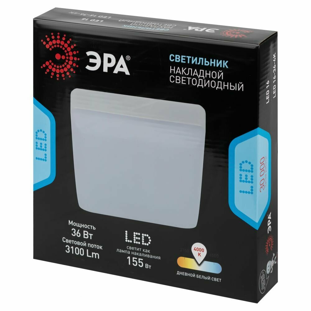 | Дополнительная информация | Светильник светодиодный ЭРА LED 16-36-4K накладной квадратный 36Вт 4000К |