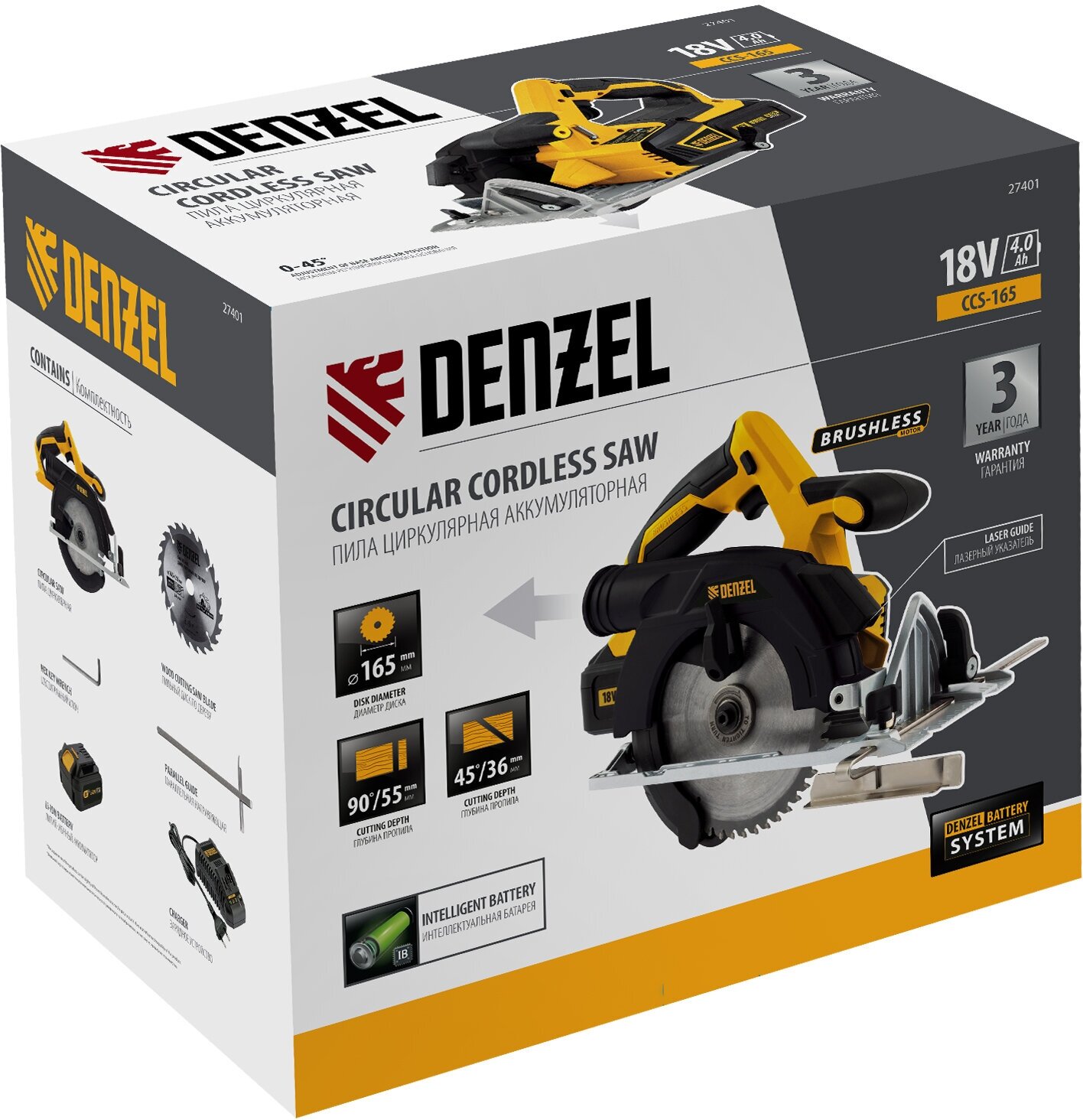 Пила циркулярная аккумуляторная Denzel CCS-165, 18В, 4Ач, бесщеточ. двигатель 27401