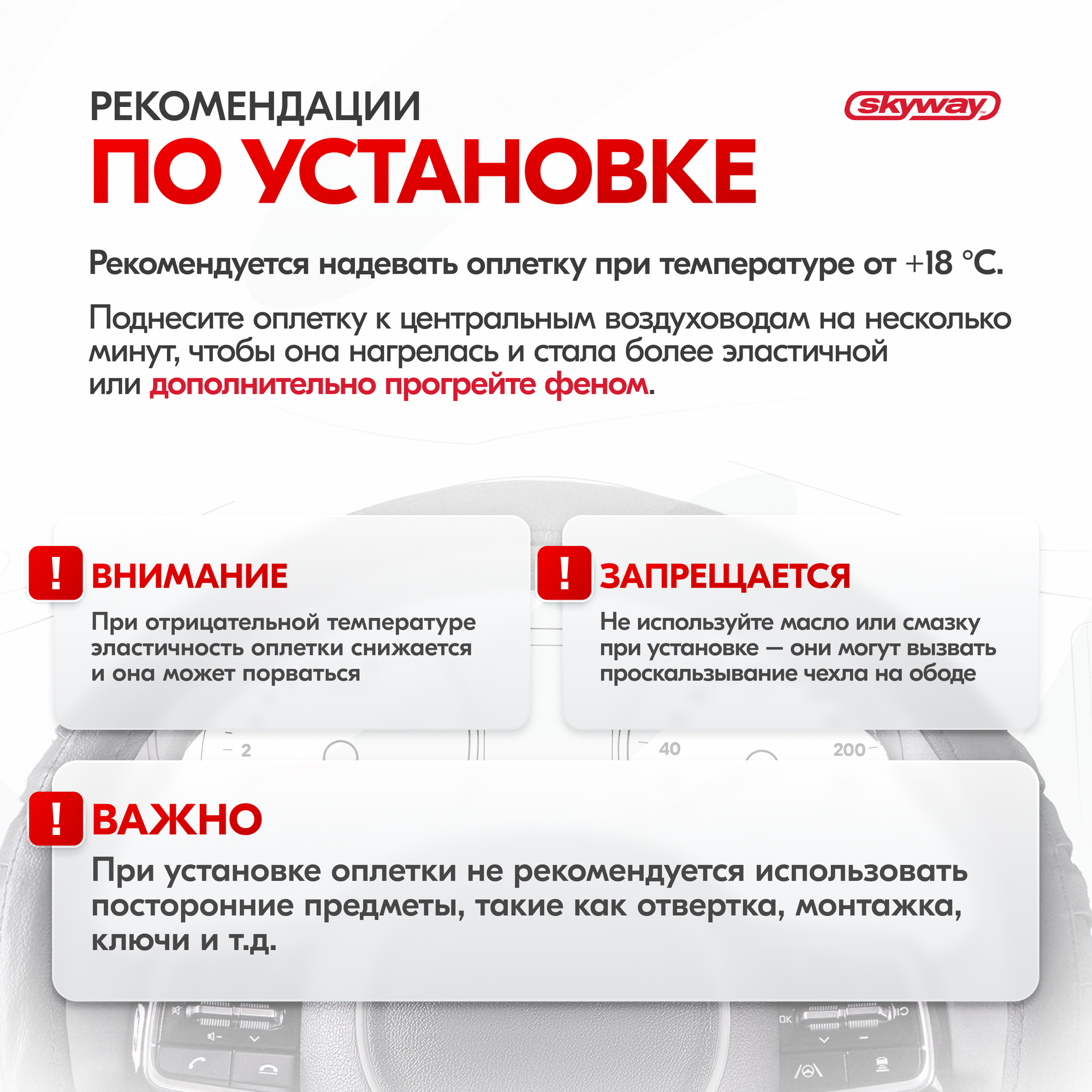 | Дополнительная информация | Рекомендации производителей: выбирайте оплётку под размер вашего рулевого колеса. Неверно выбранный размер может стать причиной проскальзывания оплётки или привести к невозможности снять или надеть её на руль. |