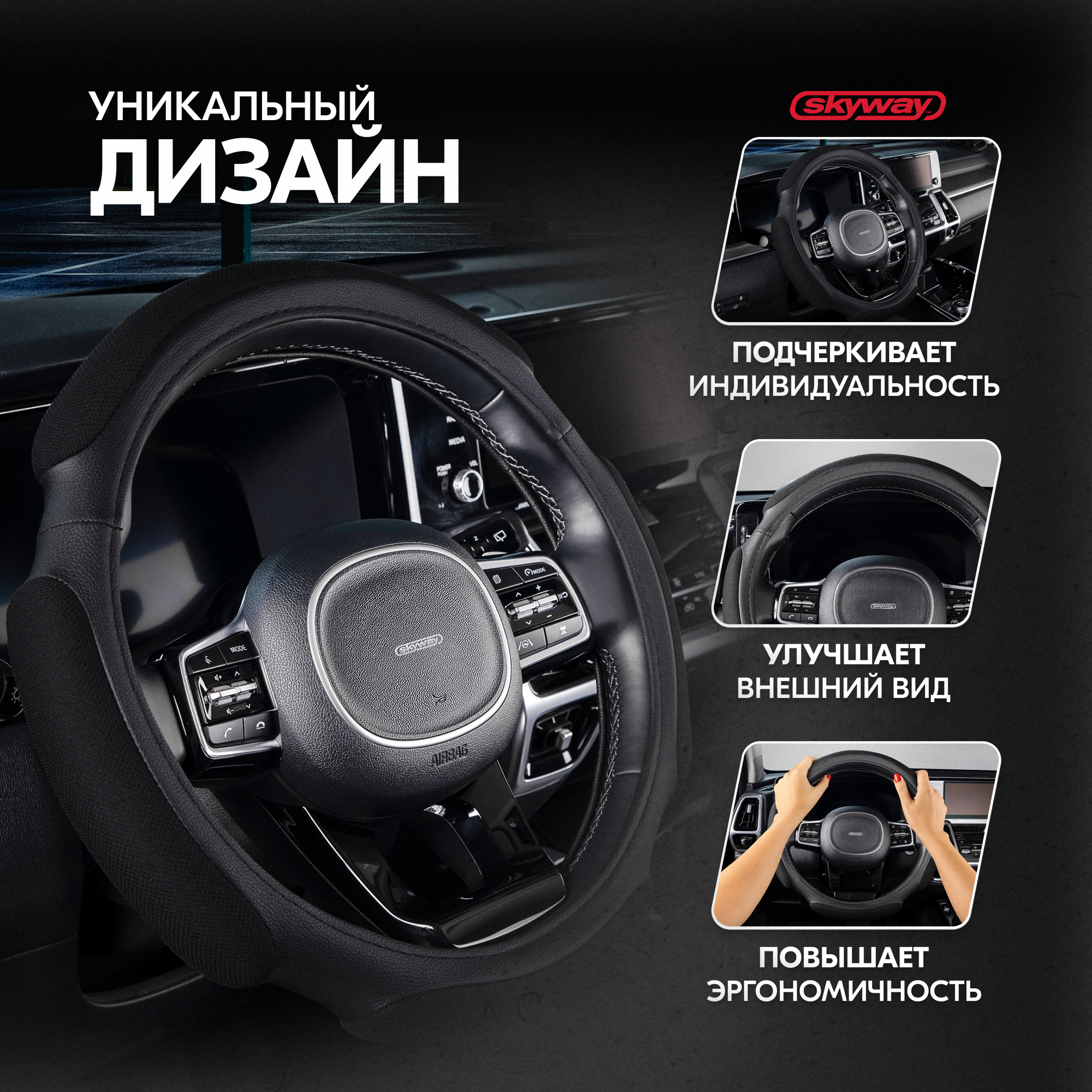 Купить Оплётка руля SKYWAY кожаная 4 подушечки Черная (M)