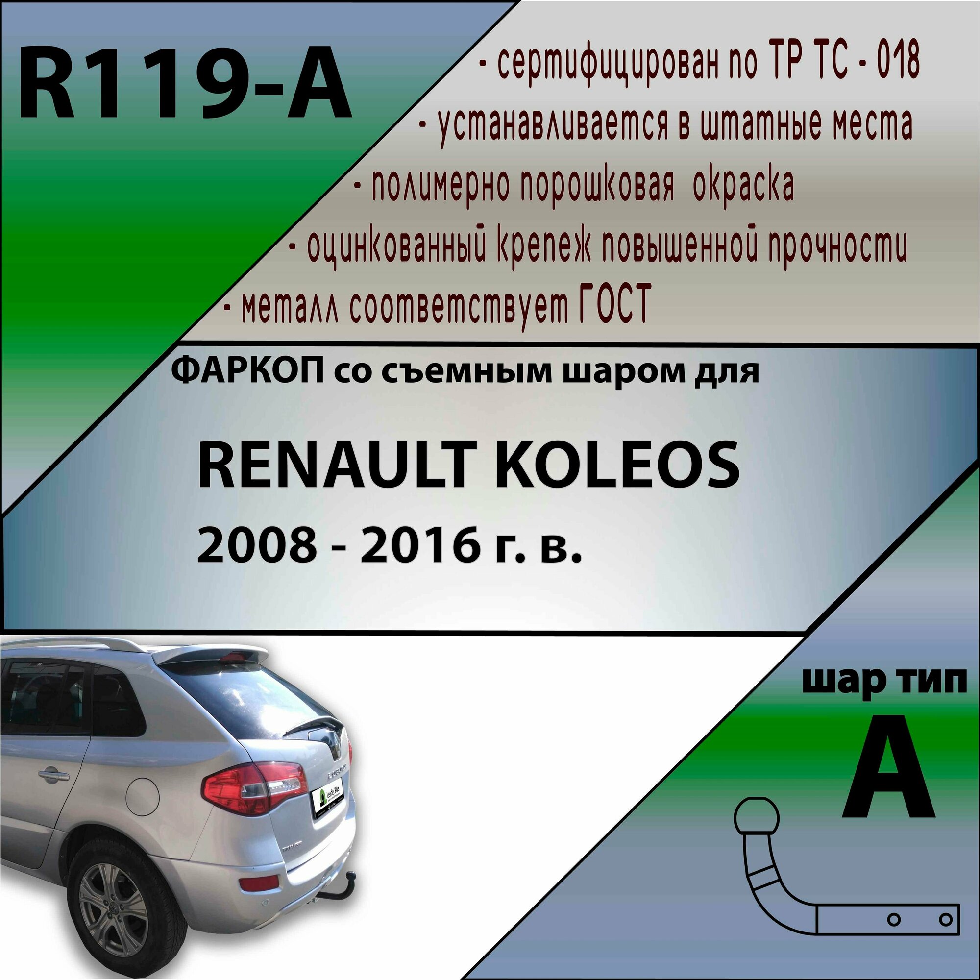 Фаркоп R119-A Лидер плюс для RENAULT KOLEOS 2008 - 2016 г. в. (без электрики) интересное: