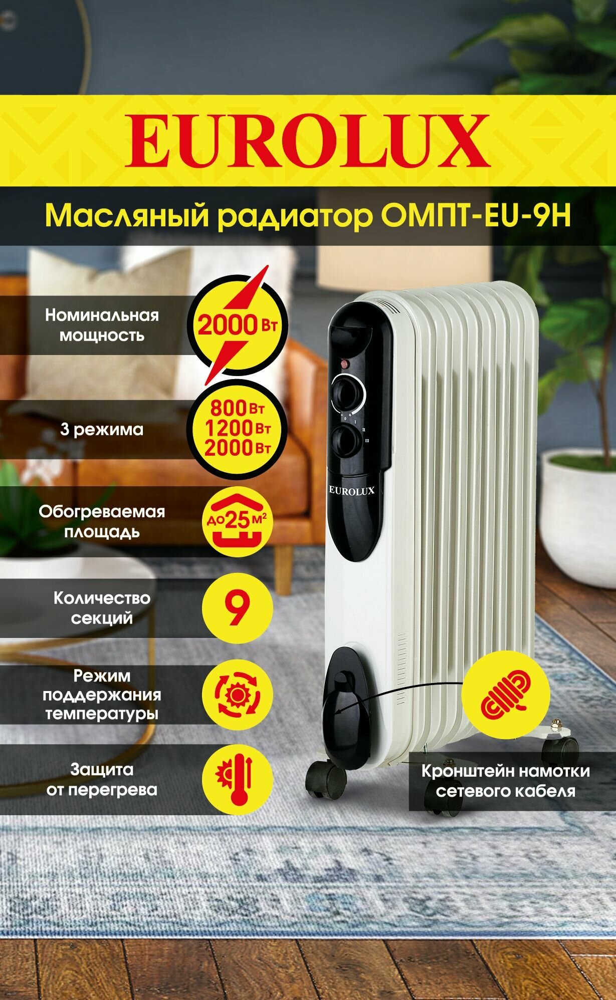 Масляный обогреватель Eurolux ОМПТ-EU-9Н, 9 секций, 2000 Вт