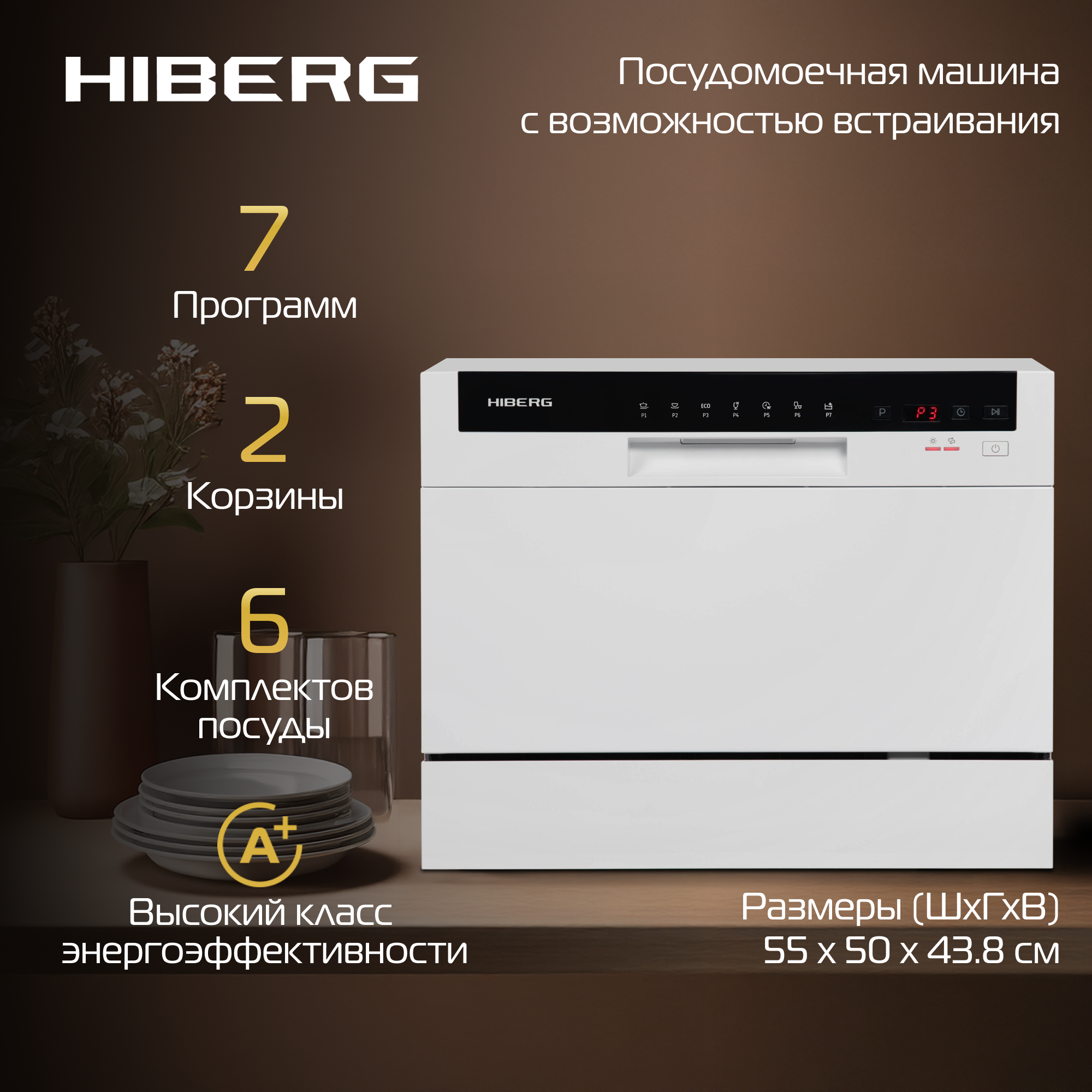 Посудомоечная машина HIBERG T56 615 W, отдельностоящая, возможность встраивания, mini, 7 программ, 2 корзины, цвет белый