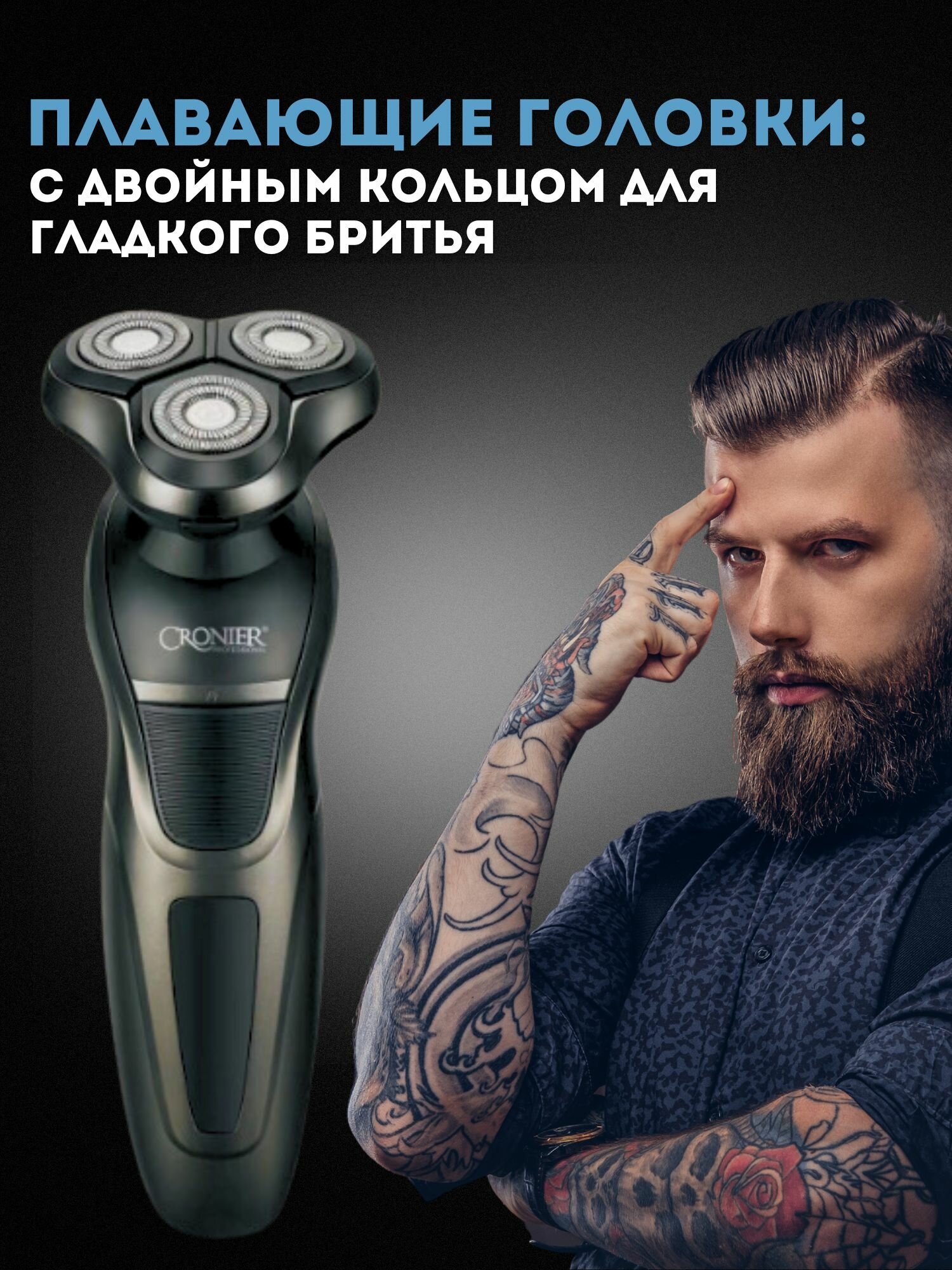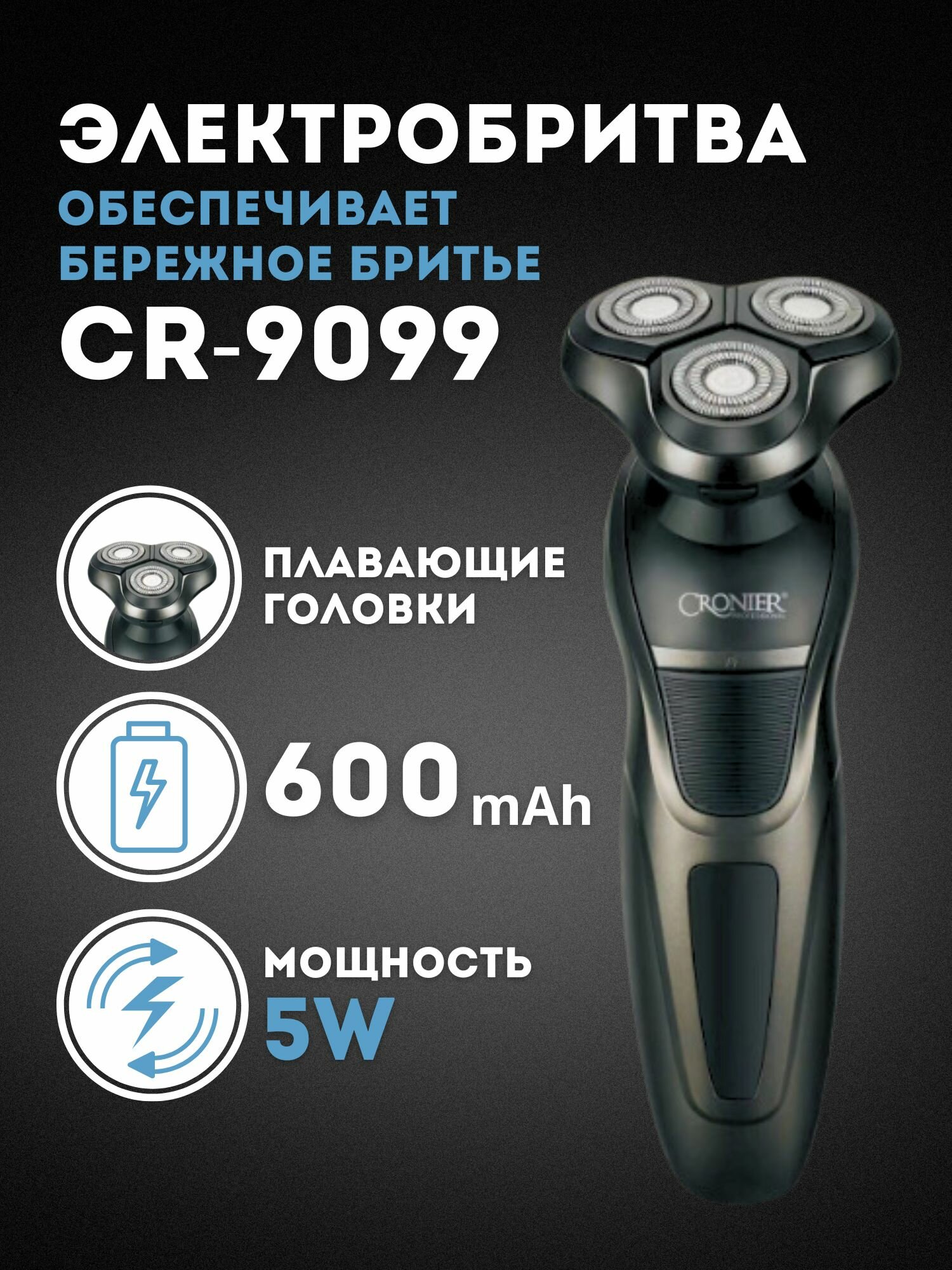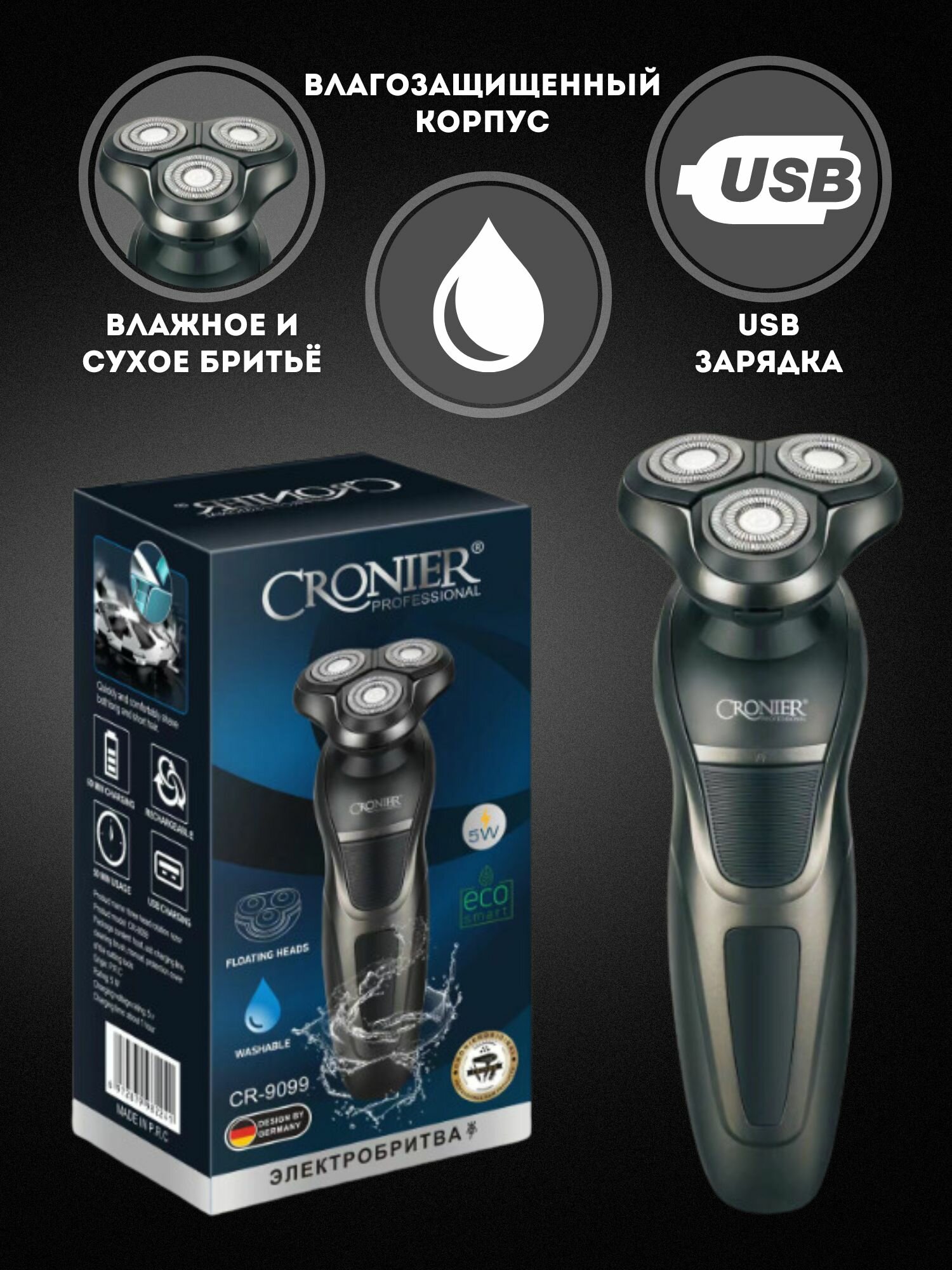 Электробритва для влажного и сухого бритья Cronier CR-9099, Электробритва с плавающими головками , серый интересное: