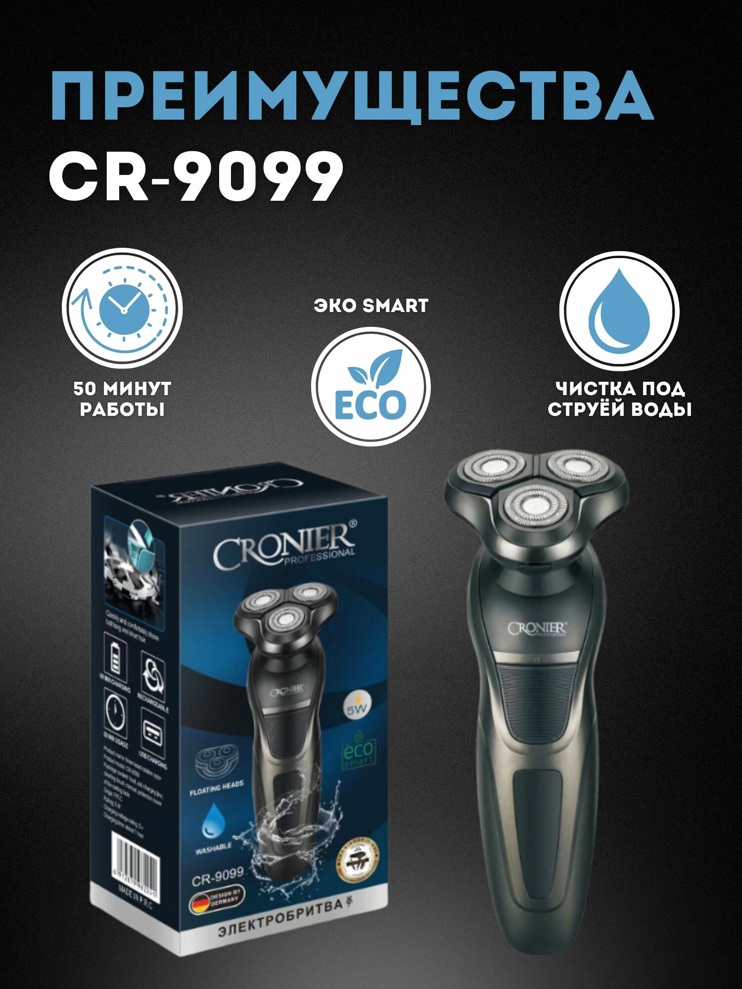 Ниже Вы можете прочитать отзывы на Электробритва для влажного и сухого бритья Cronier CR-9099, Электробритва с плавающими головками , серый, ознакомится с подробными характеристиками, посмотреть интересные обзоры и фотографии на Электробритва для влажного и сухого бритья Cronier CR-9099, Электробритва с плавающими головками , серый.