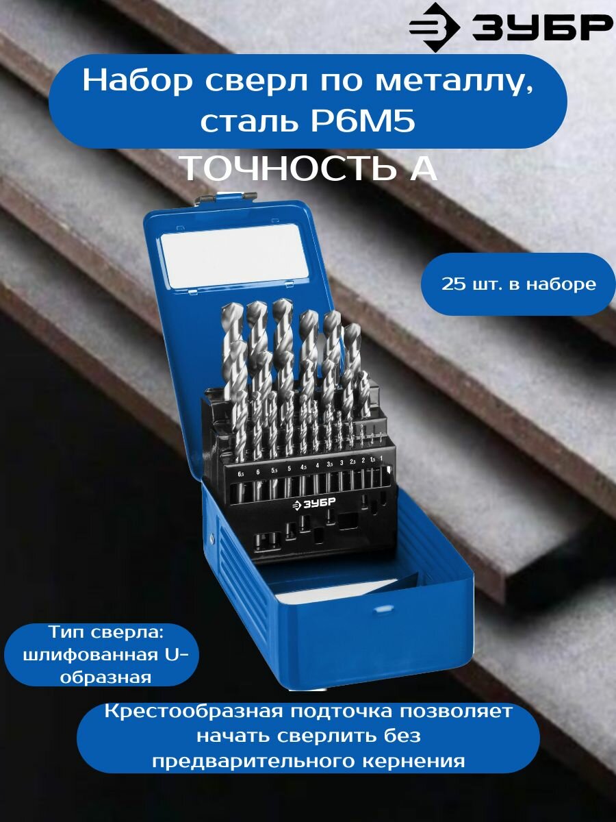 ЗУБР ПРОФ-а, 25 шт, (1-13 мм), сталь Р6М5, класс А, мет. бокс, набор сверл по металлу, Профессионал (29625-H25)
