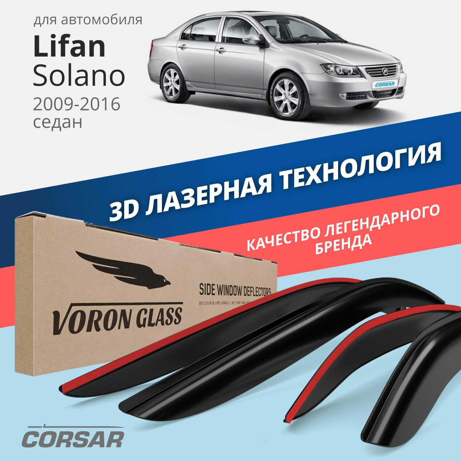 VORON GLASS DEF00484 Комплект дефлекторов серия CORSAR Lifan Solano 2009 - н.в./седан/накладные/скотч /к-т 4 шт./