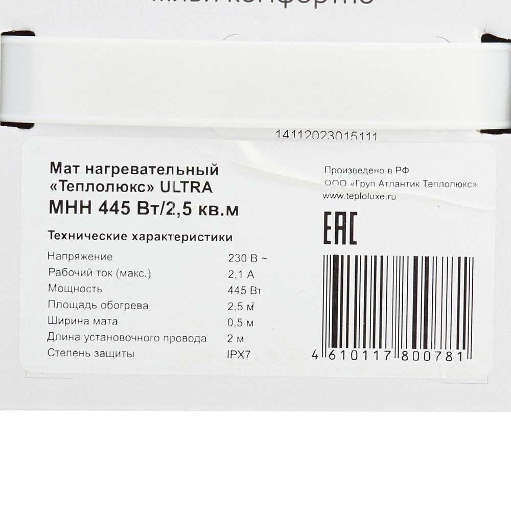 Теплый пол/Мат нагревательный "Теплолюкс" Ultra МНН 445 Вт/2,5 кв.м
