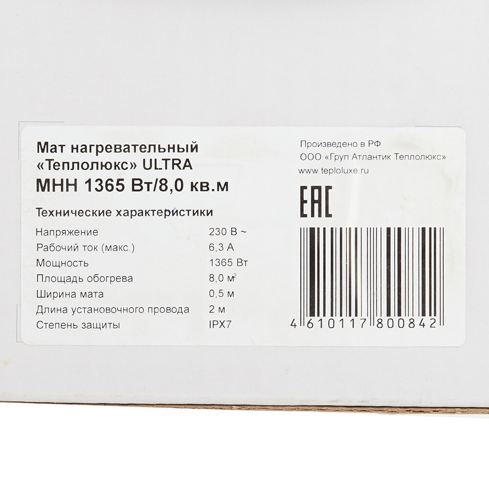 Нагревательный мат Теплолюкс ULTRA, 170Вт/м², 1365Вт, 8м², 2м холодного кабеля
