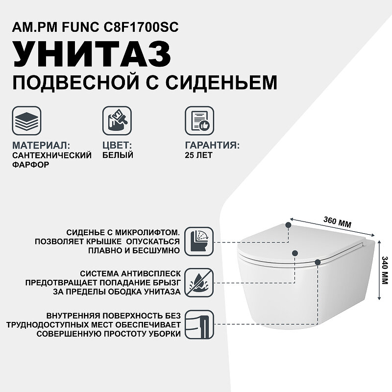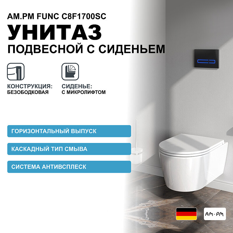 Подвесной унитаз AM.PM Func FlashClean 490х360х340 укороченный, безободковый, с сиденьем C8F1700SC интересное: