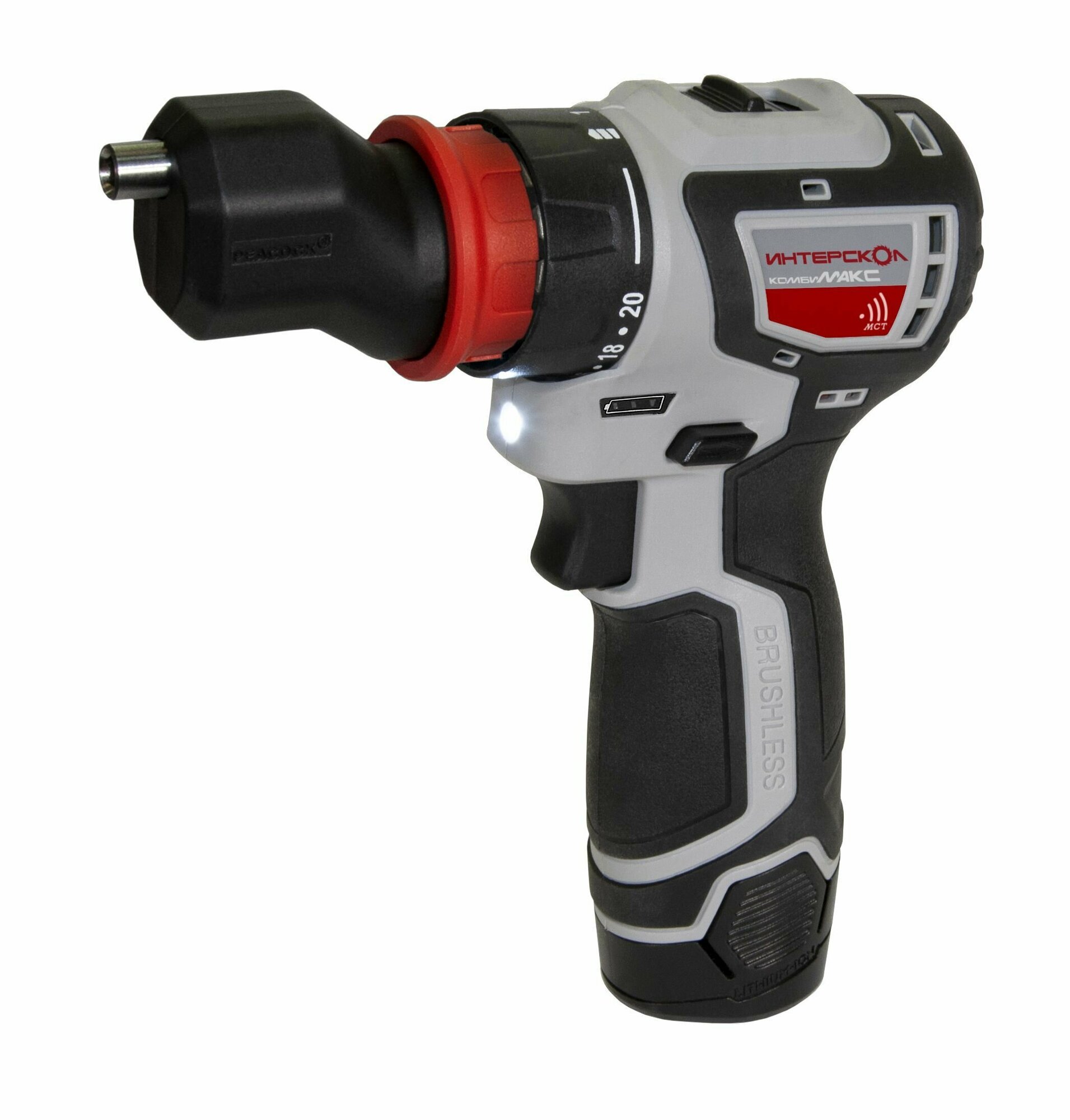 момент, достойное качество сборки, хороший пластик и резина корпуса, удобная фиксация положения эксцентриковой и угловой насадок