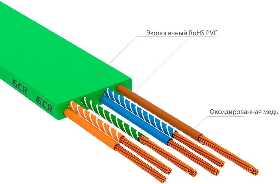 GCR Патч-корд PROF плоский прямой 15.0m, UTP медь кат.6, зеленый, 30 AWG, ethernet high speed 10 Гбит/с, RJ45, T568B, GCR-52839