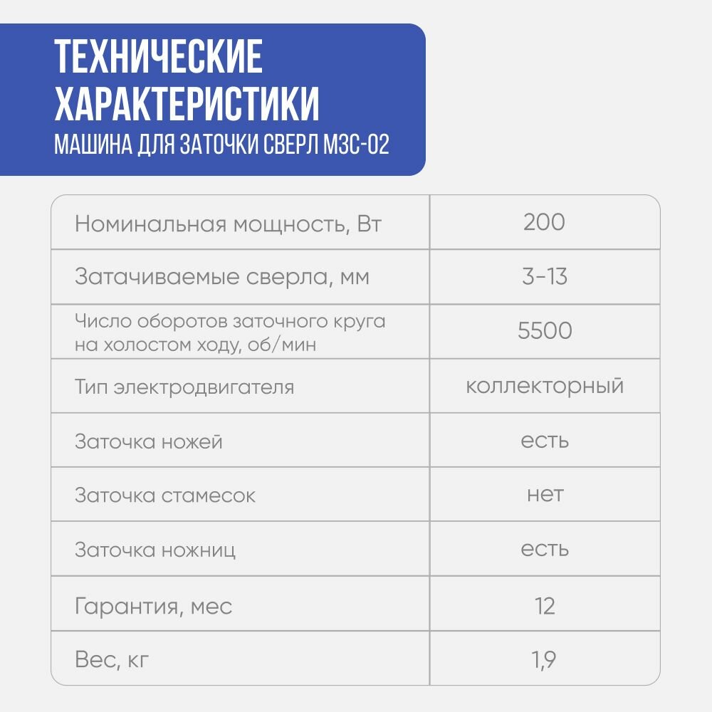 возможность заточки ножей и ножниц, диаметры заточки свёрл: от 3 до 13 мм; класс защиты машины – II (с двойной изоляцией); режим работы S2-30 мин.; наличие 2-х контейнеров для сбора стружки; тип электродвигателя коллекторный; масса не более 1,9 кг; габаритные размеры не более 210x190x120 мм