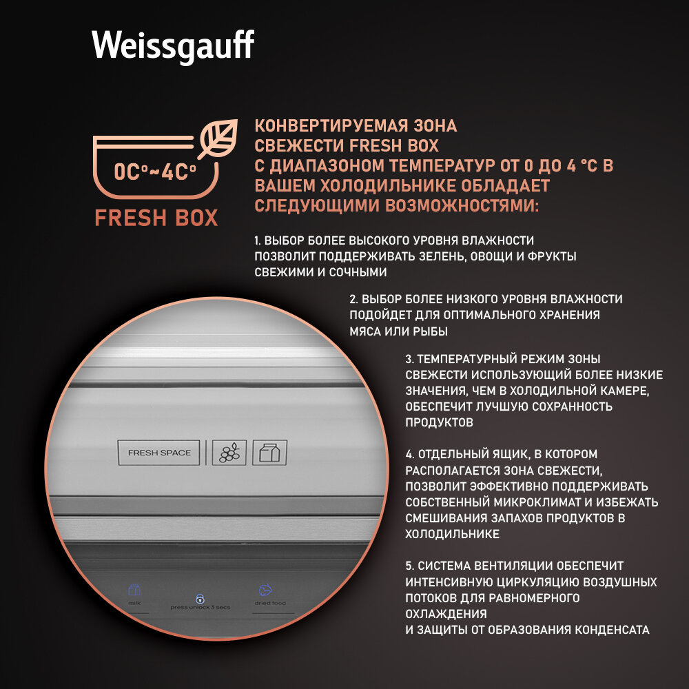 Отдельностоящий холодильник с инвертором Weissgauff WCD 590 Nofrost Inverter Premium Ecofresh Dark Inox 3 года гарантии, суперзаморозка, суперохлаждение, LED-освещение, технология Multi Air Flow и Metal-Tech Cooling
