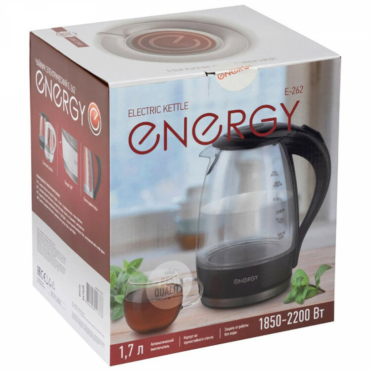 Energy Чайник электрический ENERGY E-262, стекло, 1.7 л, 2200 Вт, черный