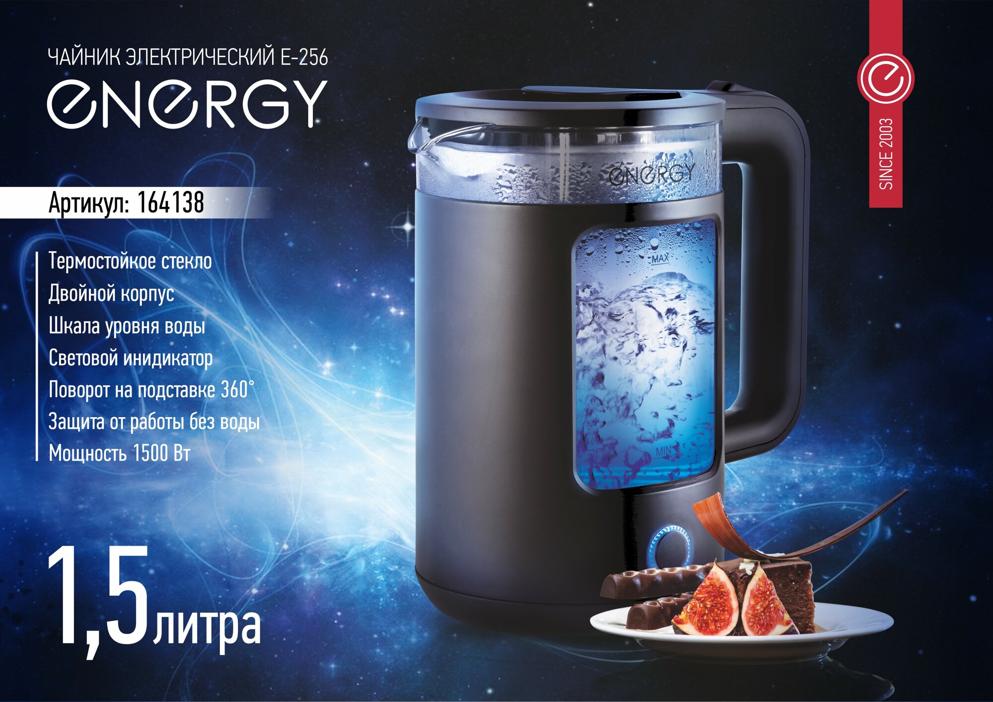 Купить Электрический чайник Energy E-256 1.5 л стекло цвет черный