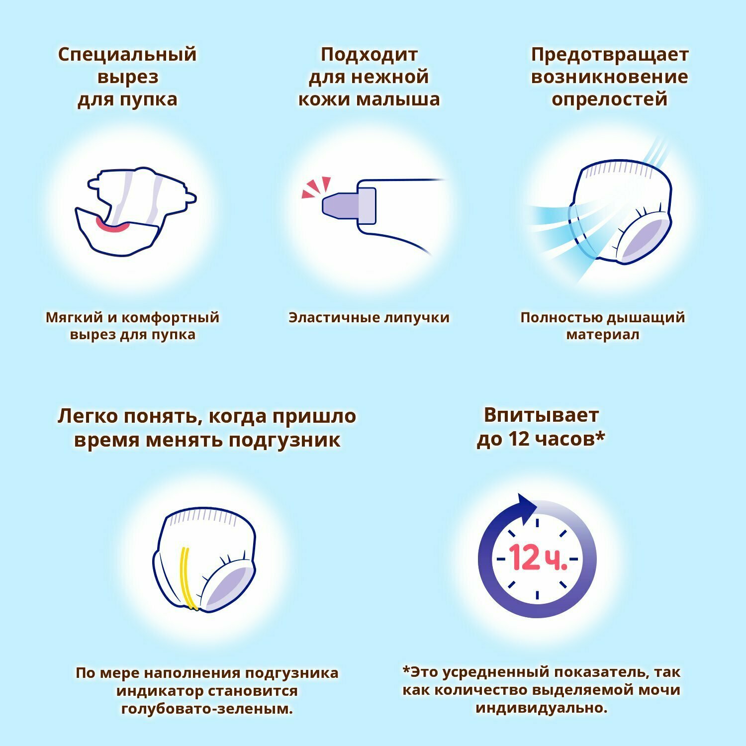 2. дышащие (попа малыша без опрелостей) 3. выгодная цена 4. наличие индикатора |