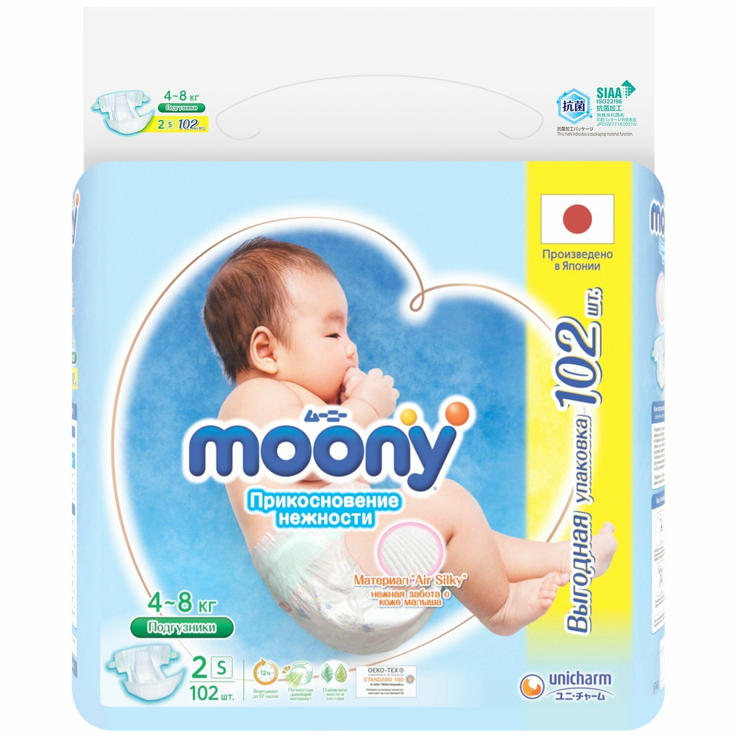 Японские подгузники для новорожденных MOONY Extra Soft 2 S 4-8 кг, GIGA 102 шт интересное: