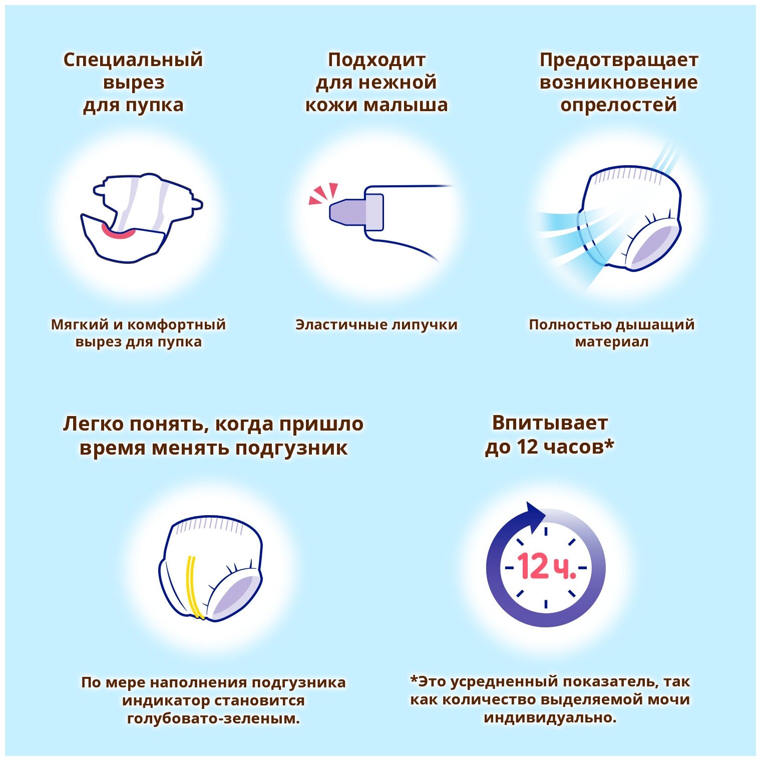 | Плюсы: | Мягкие, удобные в надевании и не подводят (протечки бывают у всех подгузников, конечно) |