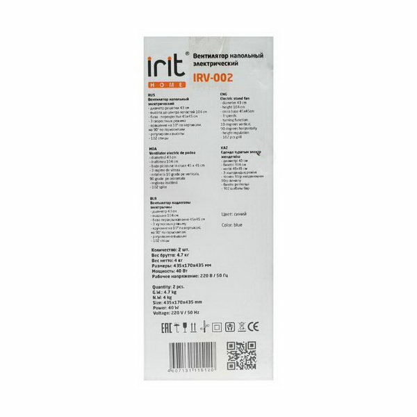 Купить Вентилятор IRV-002, напольный, 40 Вт, d=43 см, 3 режима, бело-синий, 2 шт.