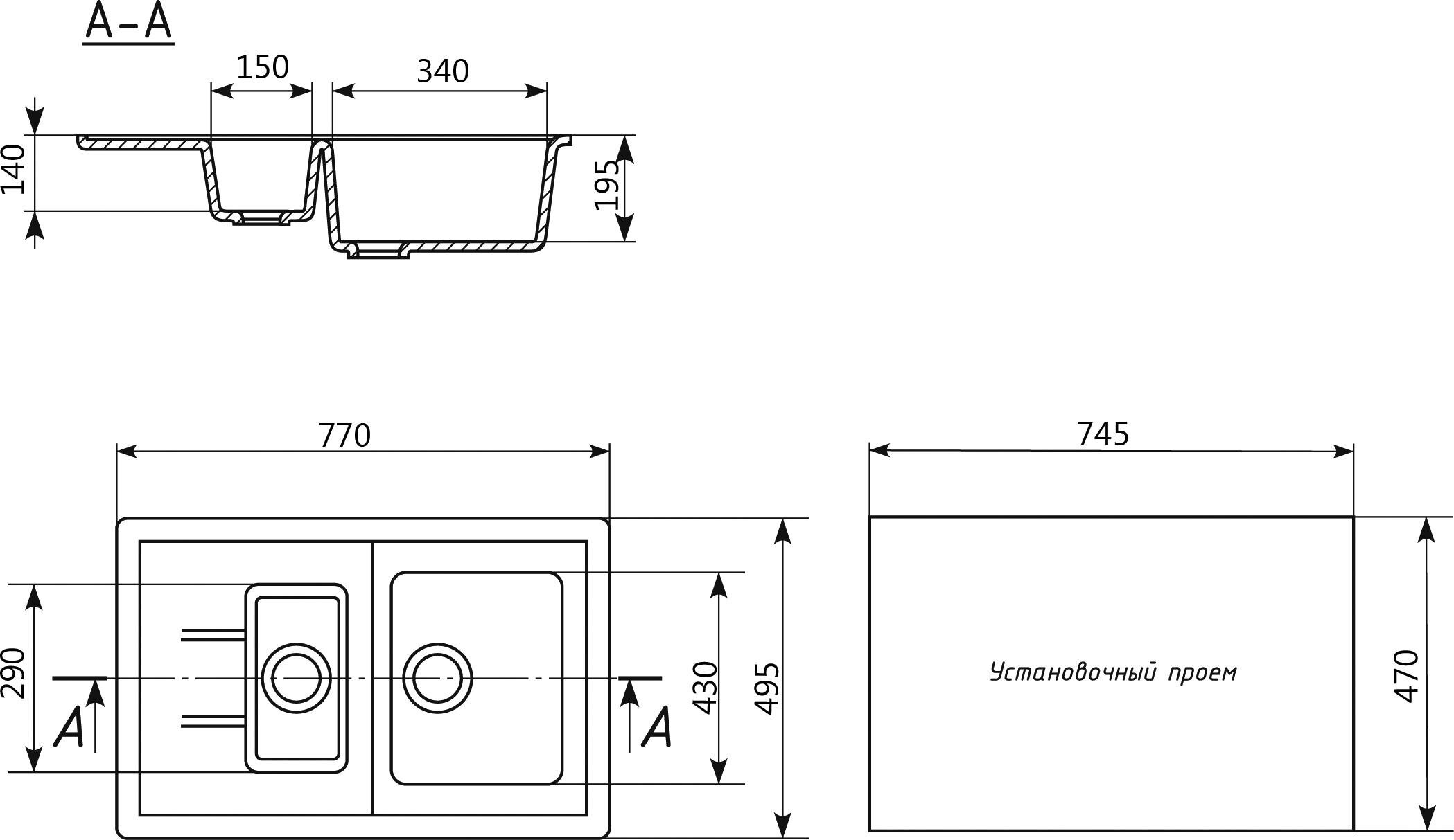 Мойка Ulgran, мрамор, U-205-309, (770*495*195 мм), темно-серый, сифон и сливная арматура