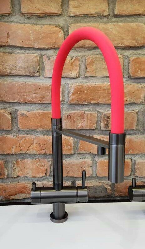 Смеситель для кухни OMOIKIRI Kanto-PVD-GM с подключением фильтра и гибким изливом, красный шланг / вороненая сталь