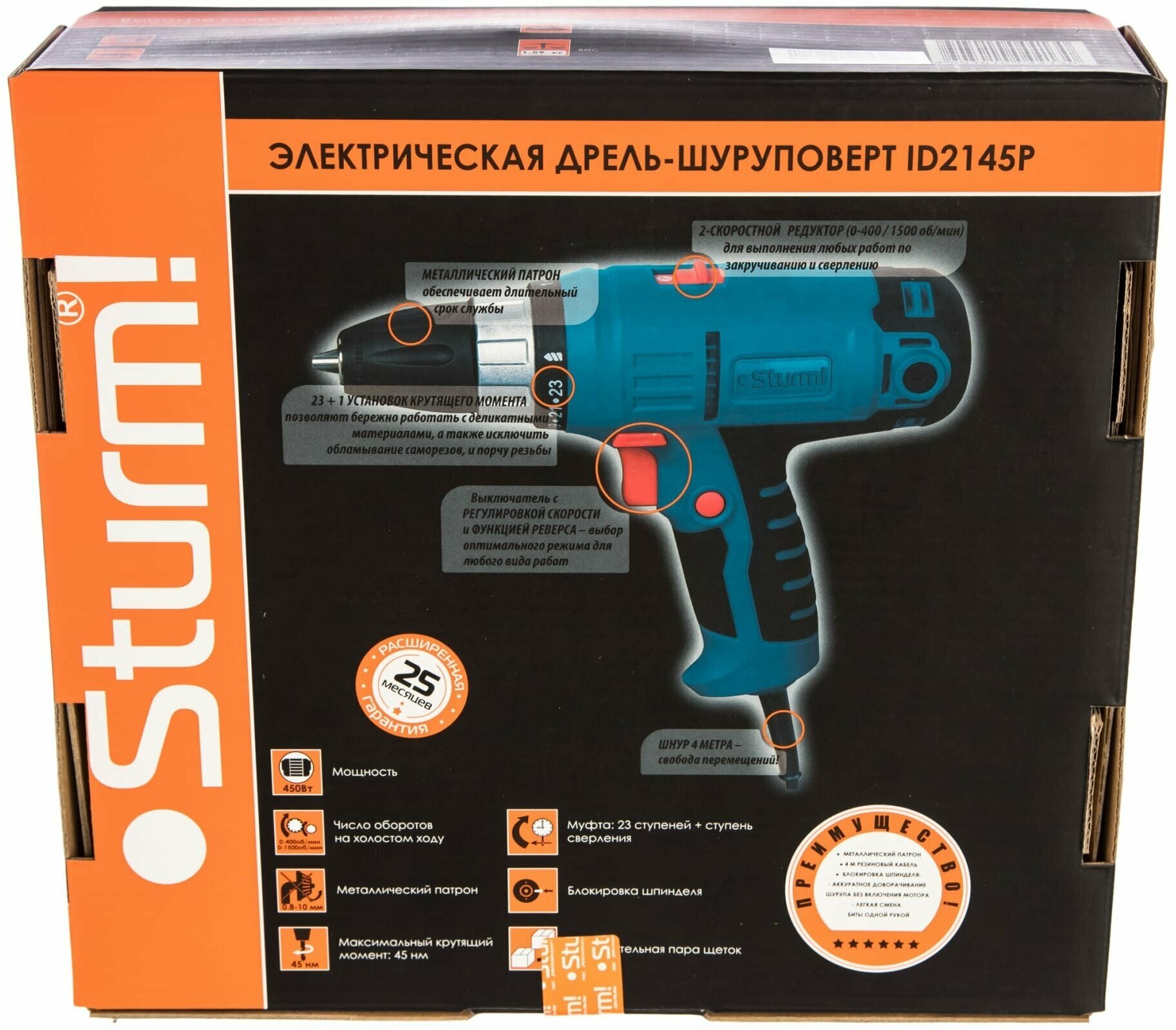 ID2145P Дрель шуруповерт "Проф", 2 скорости, патрон 10мм, 23+1, 45Нм. SoftTouch, шнур 4м,Sturm! Sturm!