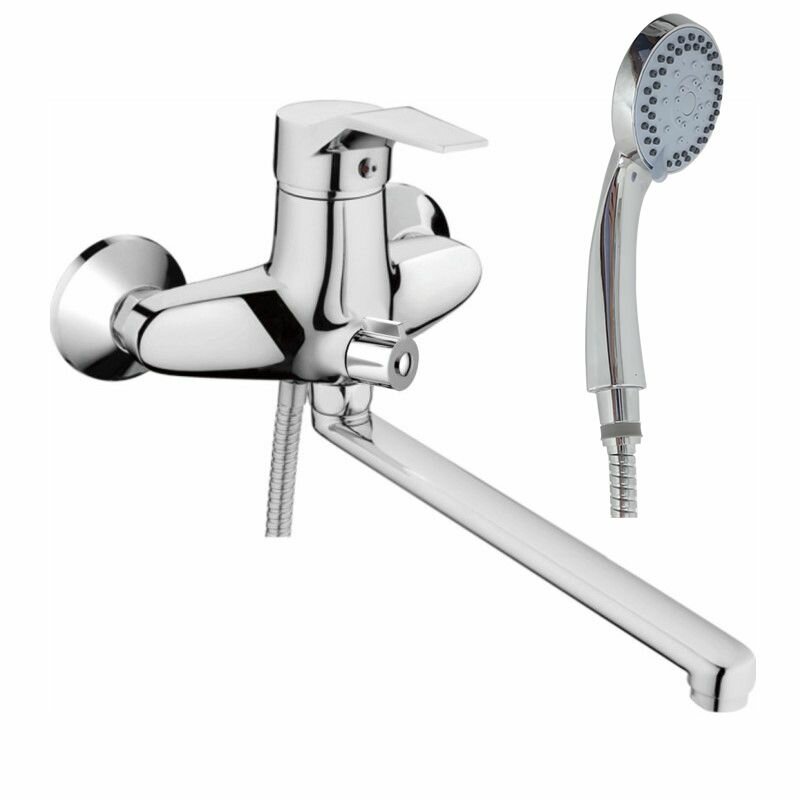 HAIBA Смеситель для ванны латунный с длинным поворотным изливом (30 см) и душевой лейкой, хромированный