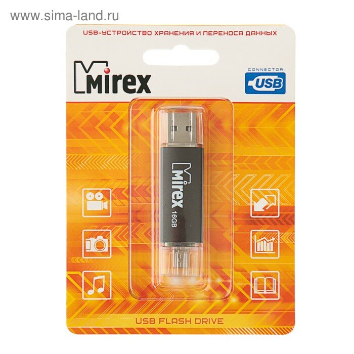 Флешка Mirex SMART BLACK. 16 Гб. USB2.0. USB/microUSB. чт до 25 Мб/с. зап до 15 Мб/с. черная 1803032