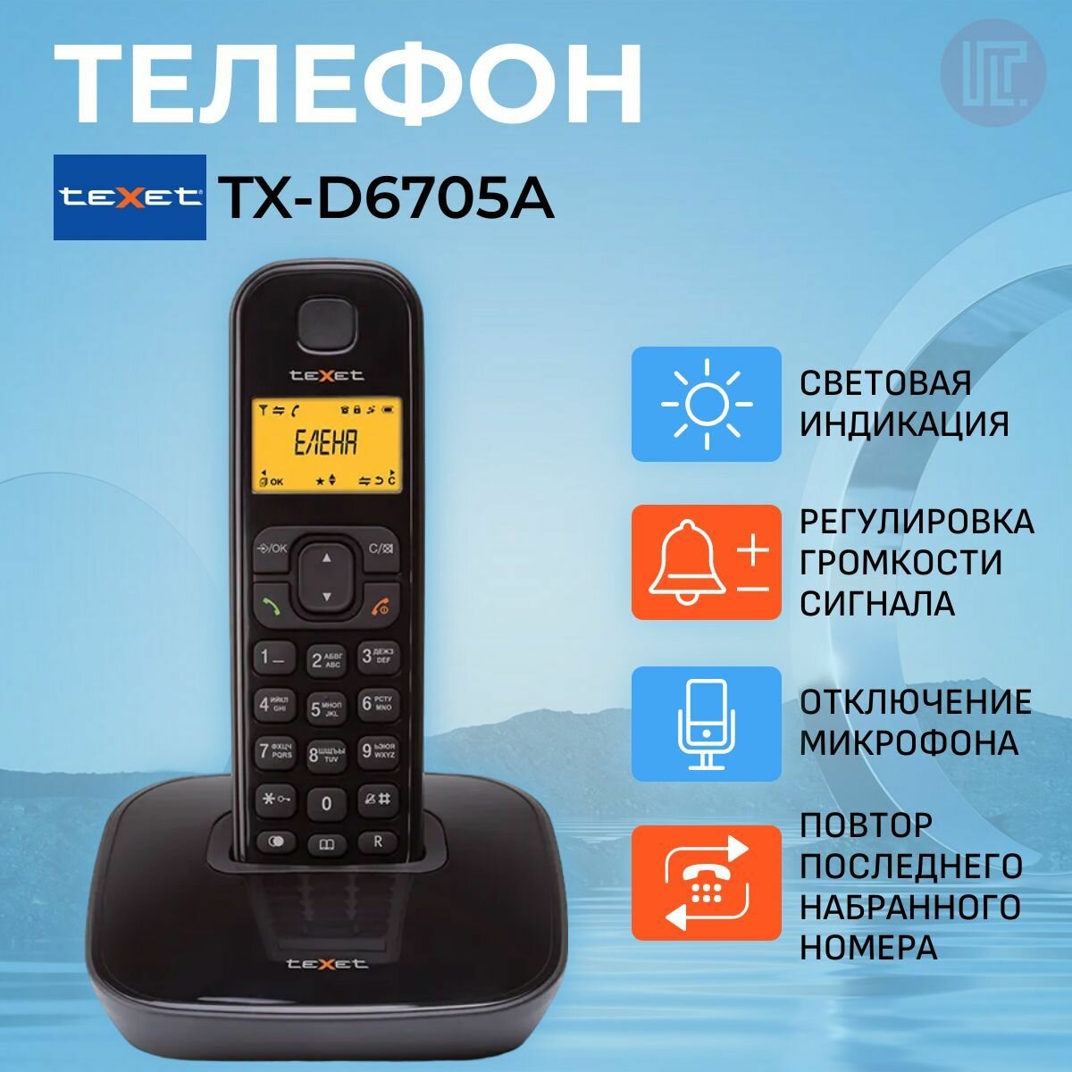 Телефон беспроводной Texet TX-D6705A, АОН, 20 номеров, черный, 344179