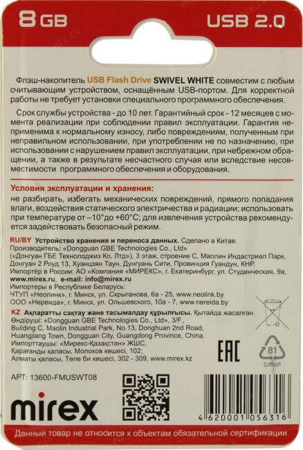 Накопитель USB 2.0 8GB Mirex SWIVEL 13600-FMUSWT08 белый (ecopack)