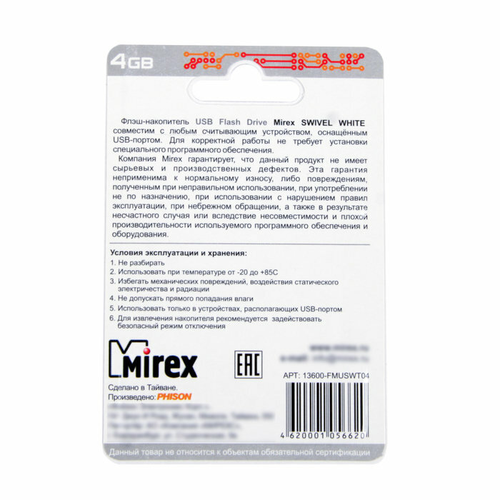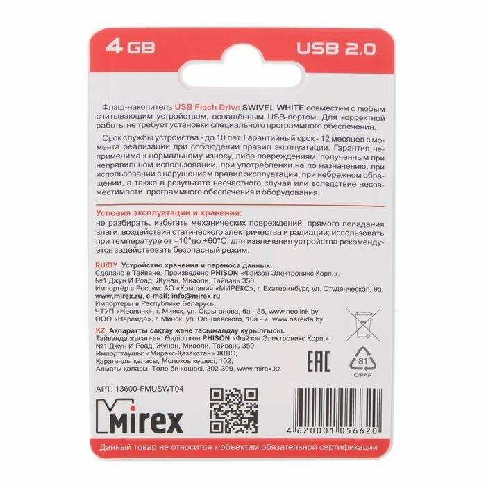Купить Накопитель USB 2.0 4GB Mirex SWIVEL 13600-FMUSWT04 белый (ecopack)