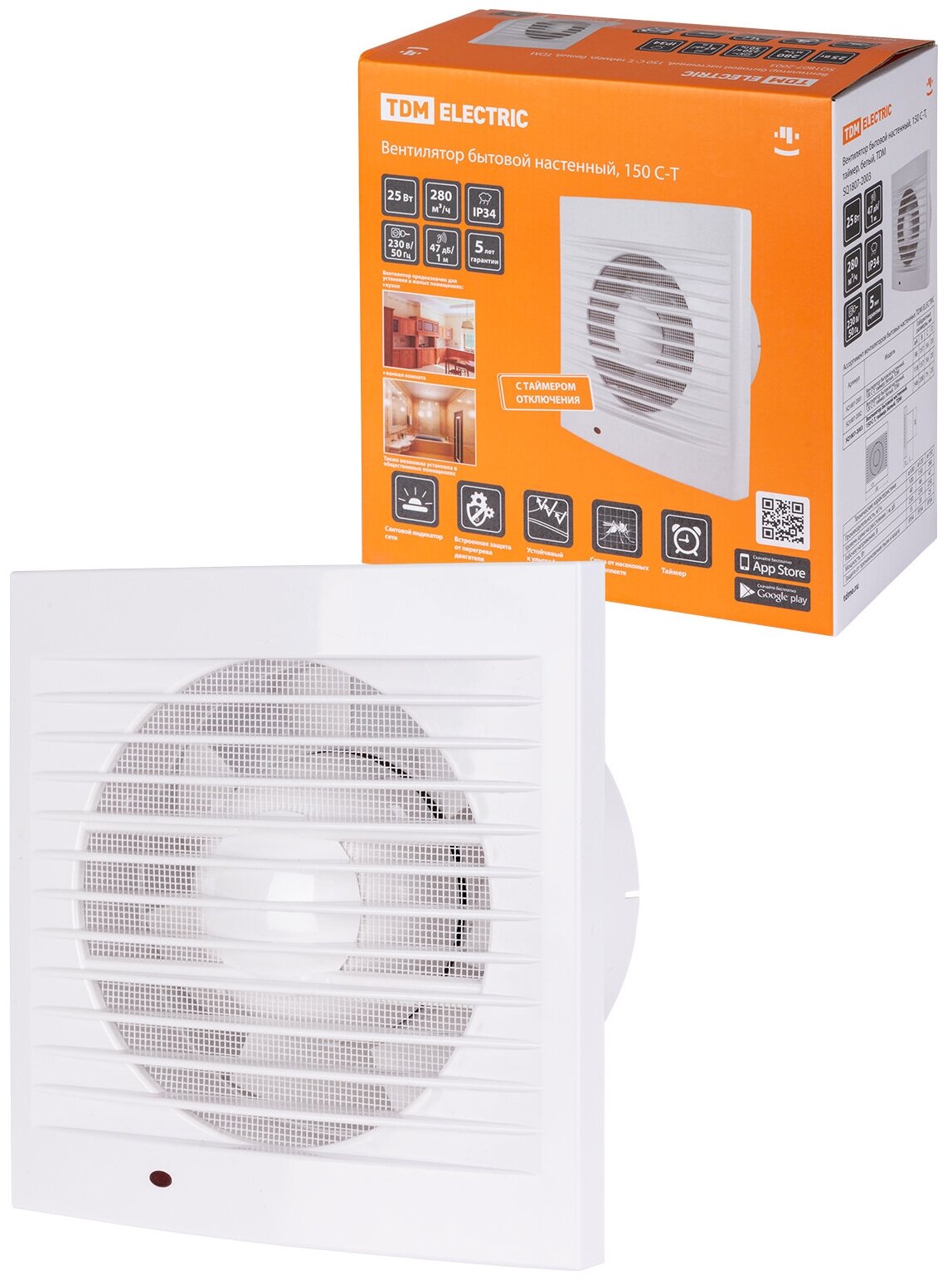 Купить TDM вентилятор бытовой настенный d=150мм 25Вт 280м3/ч 46дБ индик., москит. сетка IP34 SQ1807-0003
