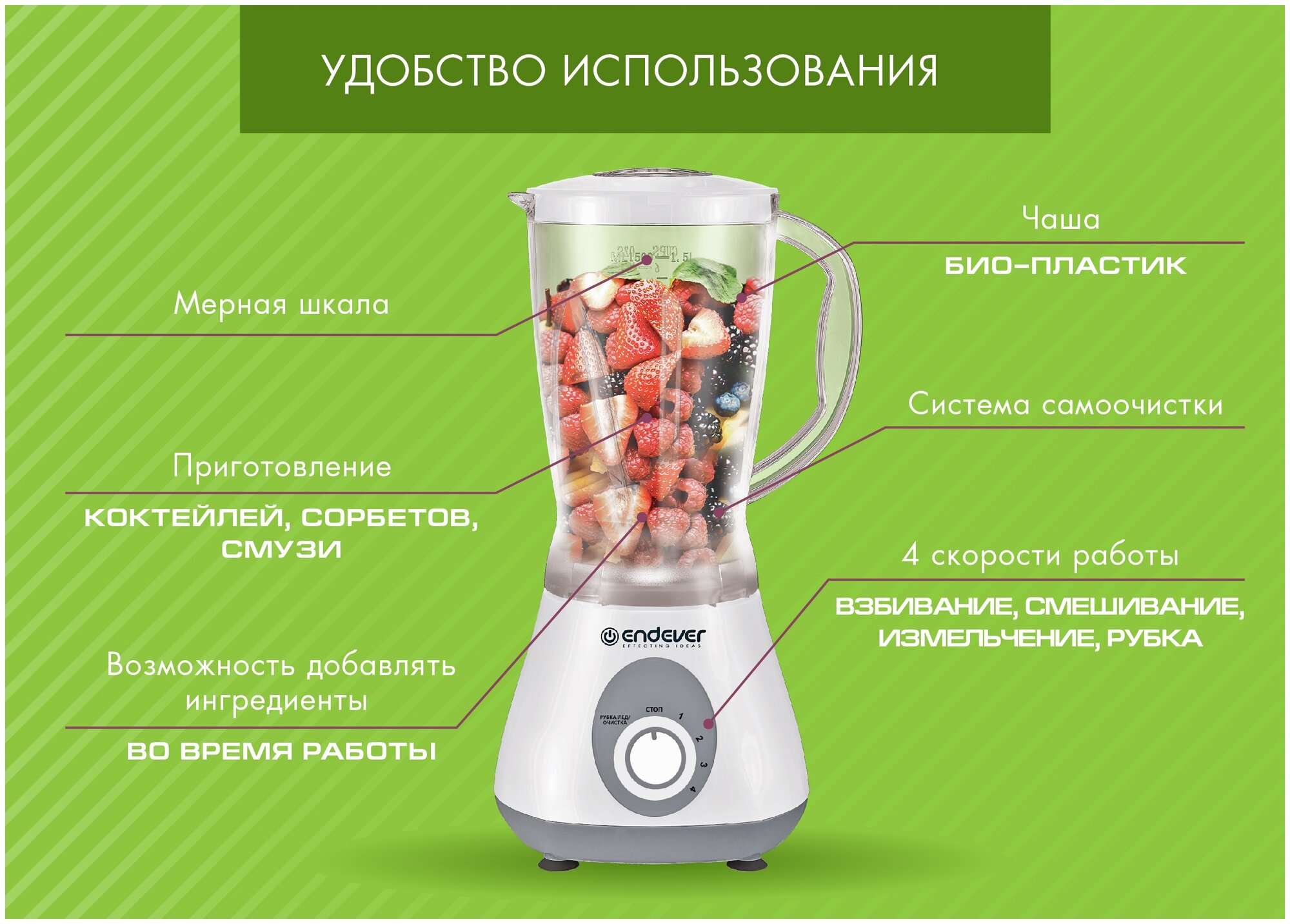 Блендер стационарный Endever Sigma-015 / 800 Вт / 1,5л / 4 скорости для взбивания, измельчения, смешивания, рубки / чаша из био-пластика