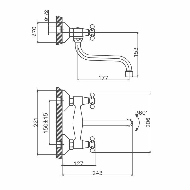 Купить CRON Смеситель для кухни (Zn) настенный,трубчатый повор.излив 177мм,двухвентельный,гайка,хром,CN4608