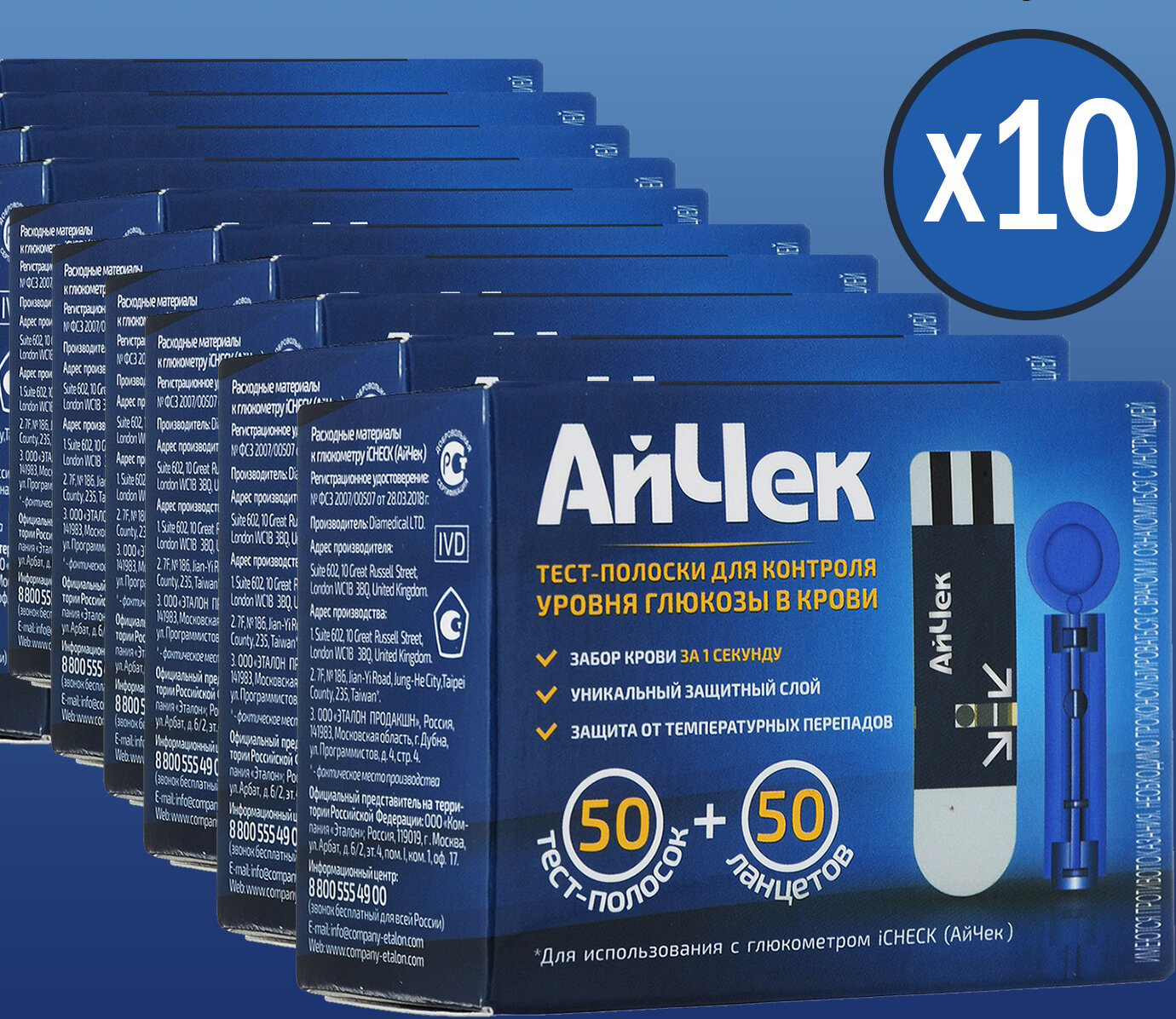 Купить Тест- полоски АйЧек (iCheck) №50 - 10 упаковок (+ ланцеты № 50) - 10 упаковок