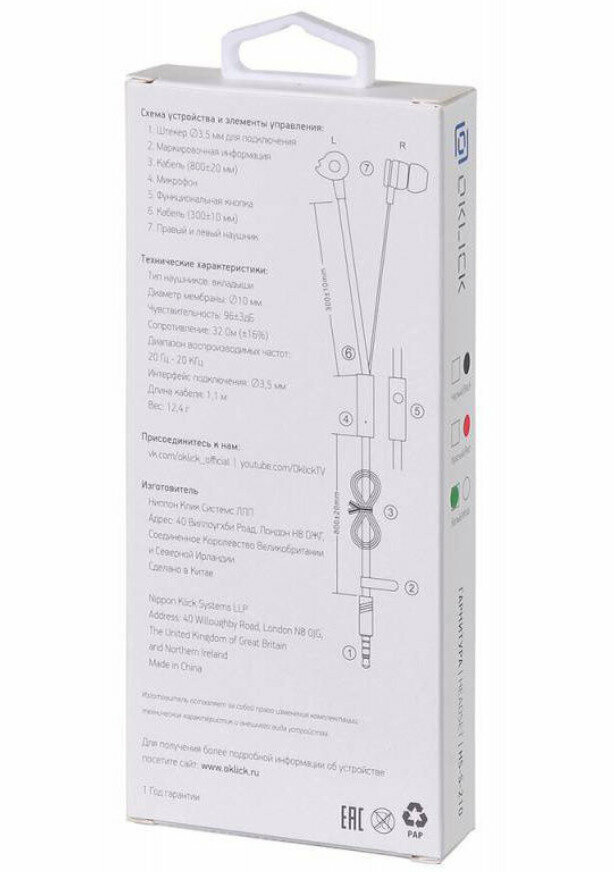 Гарнитура вкладыши Oklick HS-S-210 белый