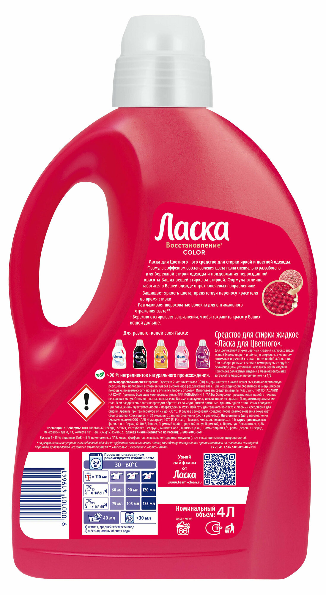 Купить Средство для стирки жидкое автомат 4 л ласка "Для цветного", гель-концентрат, 2587821