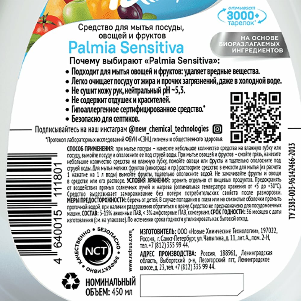 Купить Гипоаллергенное средство для мытья посуды, овощей и фруктов Palmia Sensitiva 0,45л ПЭТ