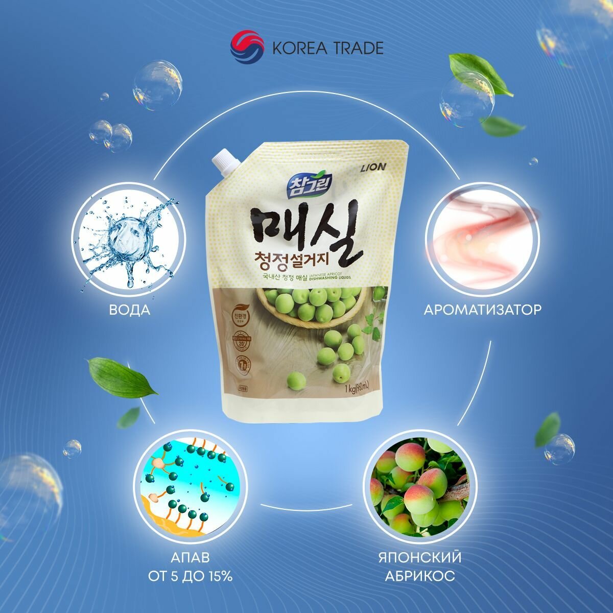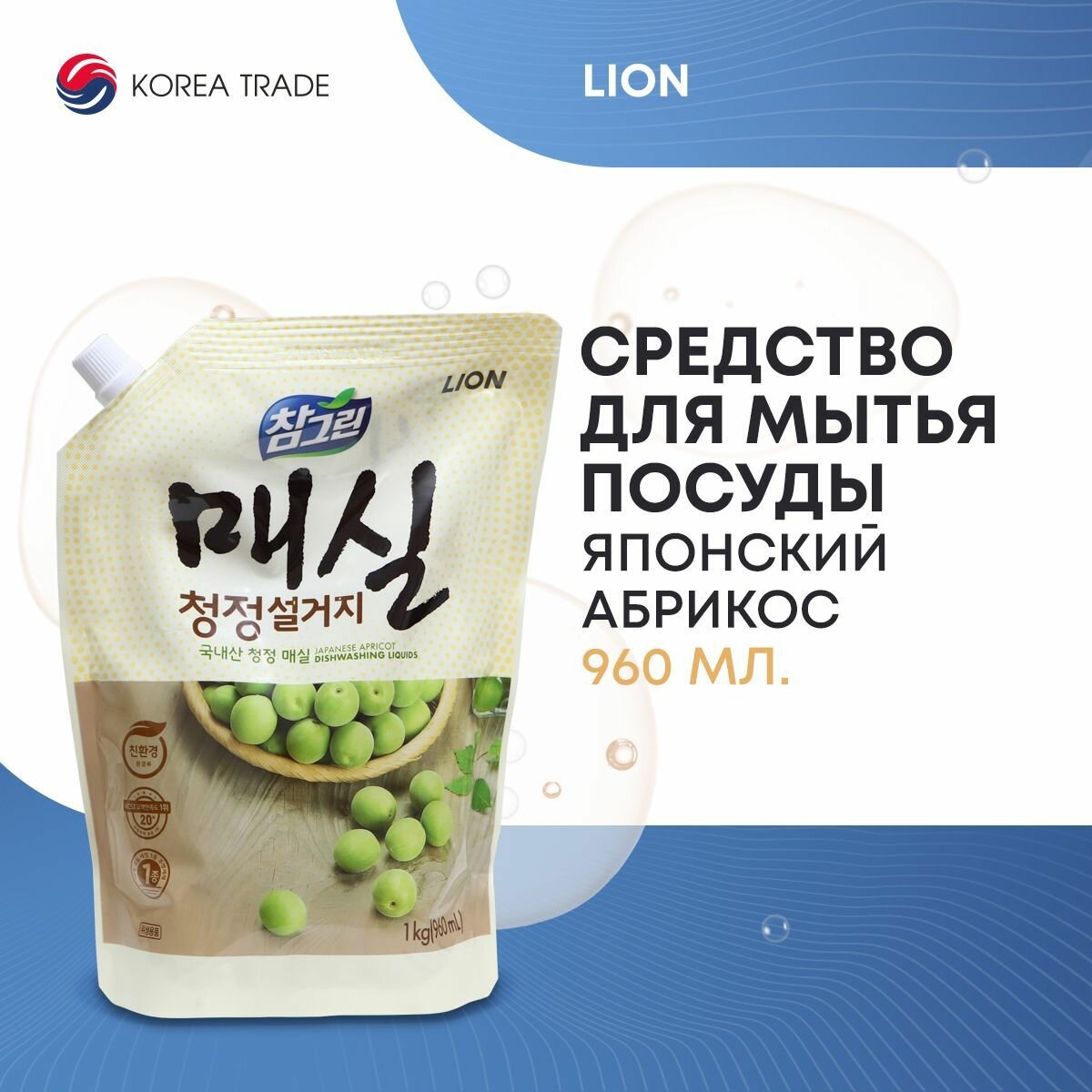Lion Chamgreen "Японский абрикос" 960 мл Средство для мытья посуды, фруктов, овощей "Японский абрикос"