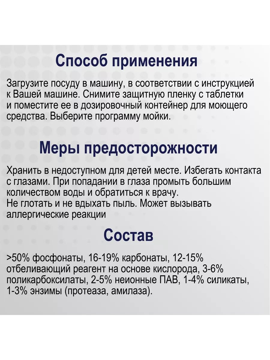 | Отзыв: | Неплохие таблетки для пмм, отмывают хорошо на долгом режиме. На режиме быстрой мойки остаются разводы. К минусам это не могу приписать, потому что в инструкции сказано что таблетка не всегда успевает раствориться за короткое время. Но и из этого нашла выход - для быстрого режима использую половину таблетки. Сравнивать пока не с чем, но за свою цену - вариант достойный |