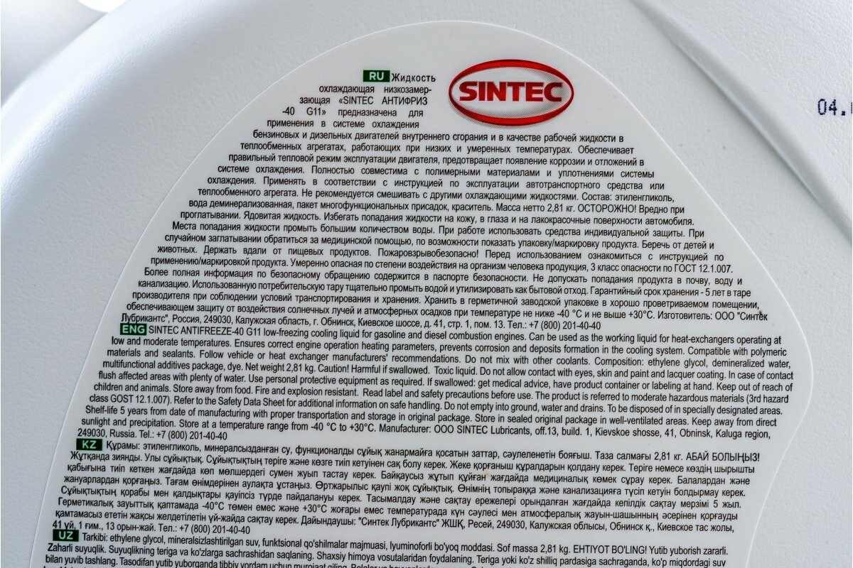 Антифриз SINTEC EURO G11 (-40) 3 л, 1 уп.