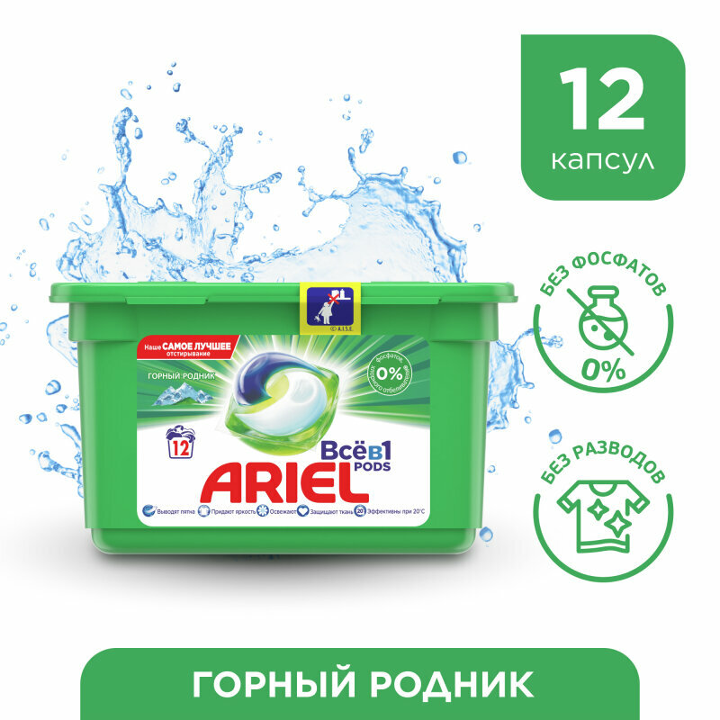 Капсулы для стирки Ariel Pods, Все-в-1, Горный Родник, 12 шт