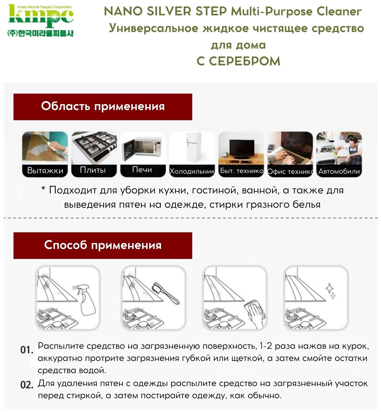 KMPC Nano silver step Multi-Puporpose Cleaner Универсальное жидкое чистящее средство для дома с серебром 550 мл с распылителем