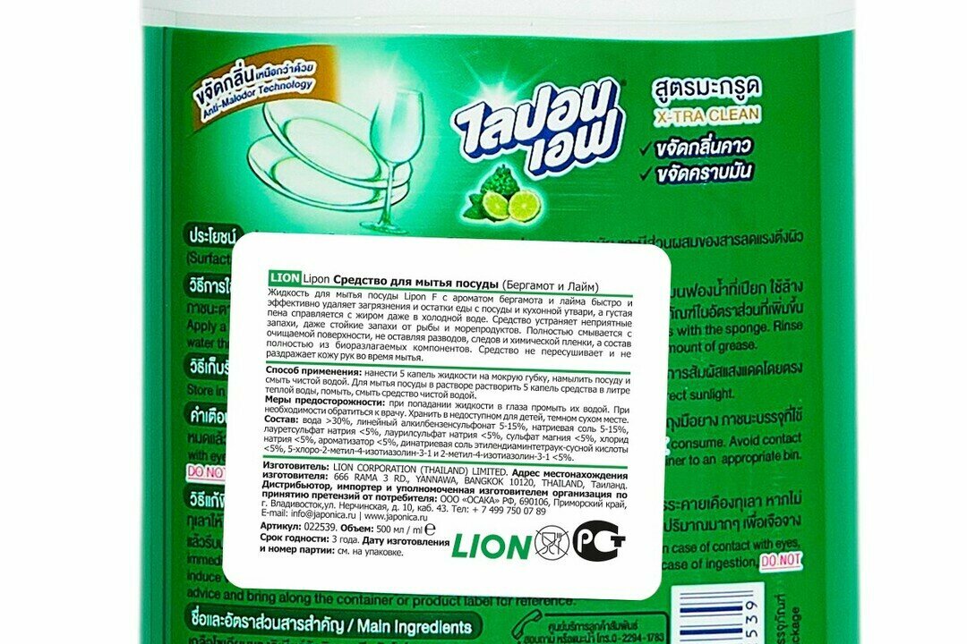LION Lipon Средство для мытья посуды Бергамот и Лайм 500 мл