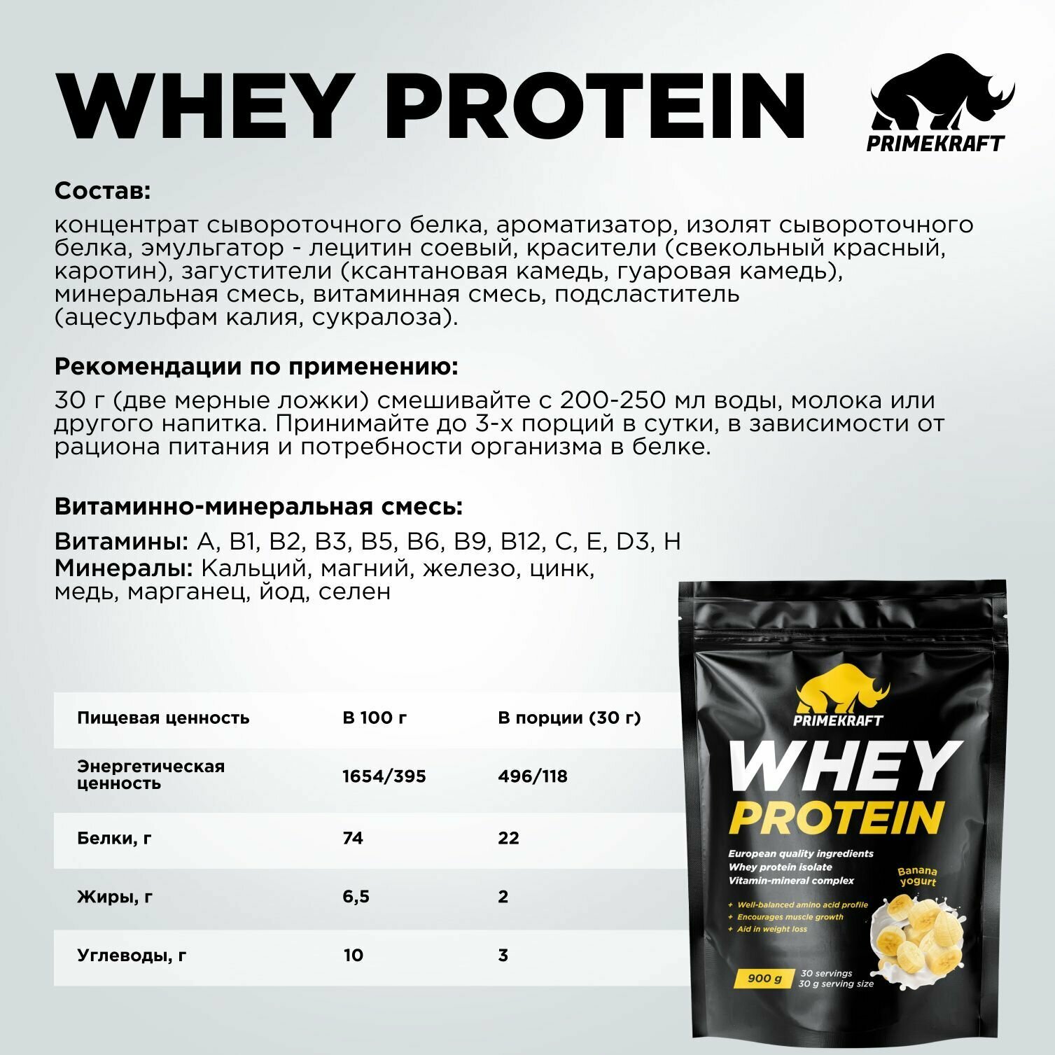 Купить Протеин сывороточный PRIMEKRAFT Whey Protein, Банановый йогурт 900 г / 30 порций