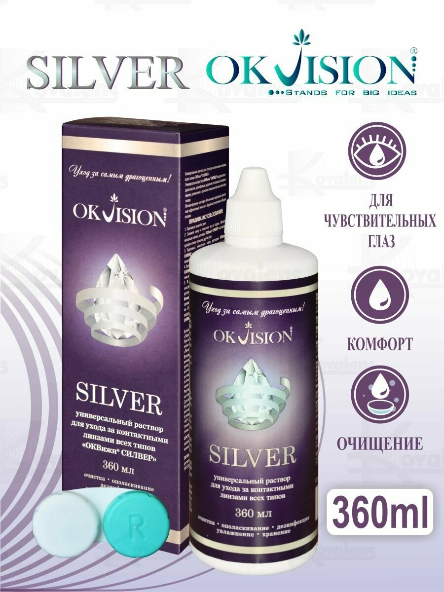 Универсальный раствор для контактных линз OKVision SILVER, 360 мл, средство / жидкость для ухода за линзами + контейнер
