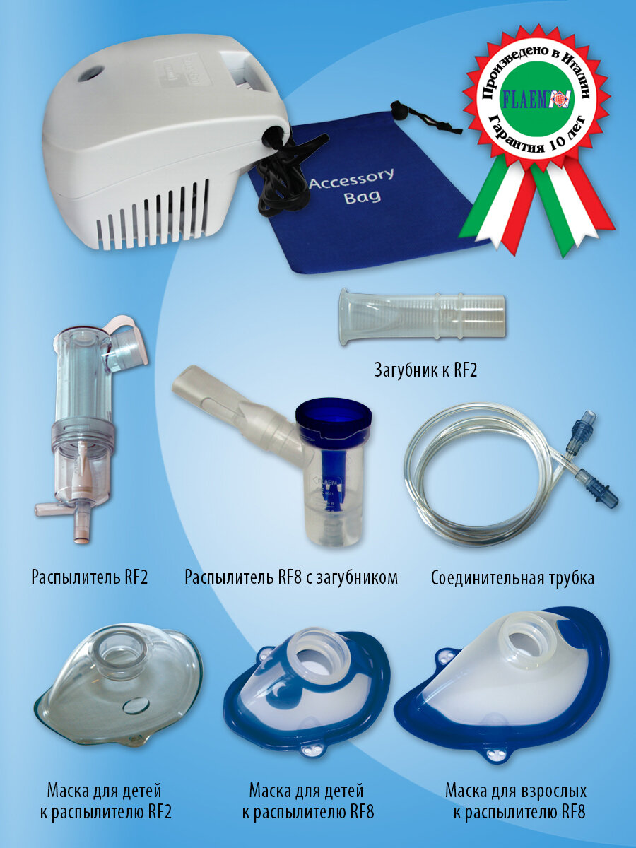 | Плюсы: | Не дорогой. Сделано в Италии. 5 лет гарантии. Компактный, удобный. Хорошая комплектация. 2 маски и 2 насадки для ингаляции. 3 уровня тонкости фильтрации частиц. |
