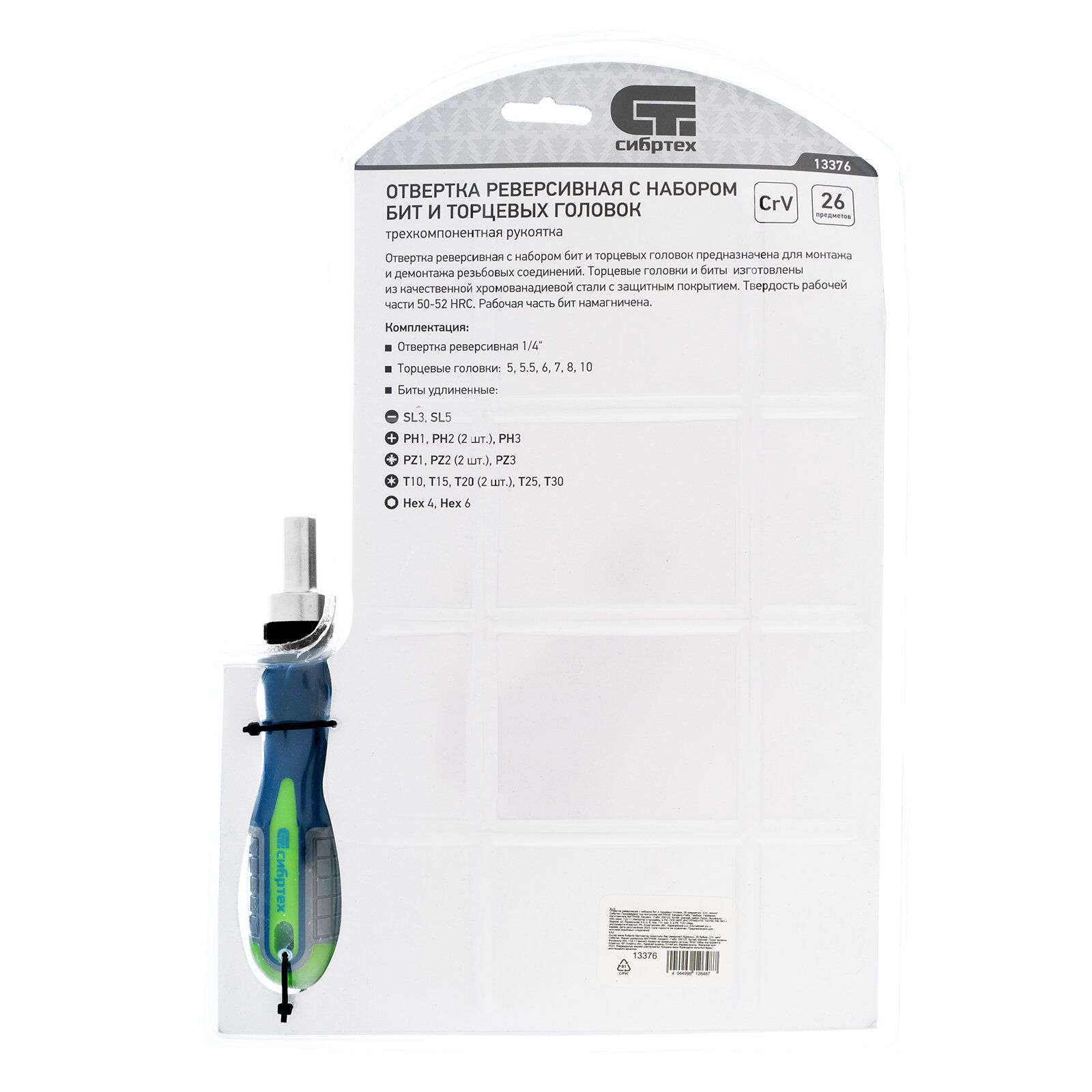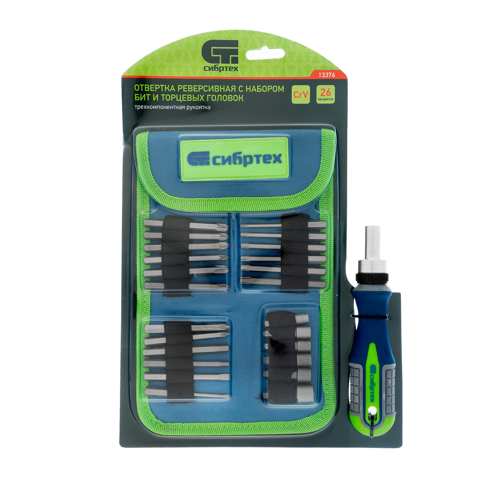 Отвертка реверсивная СИБРТЕХ 13376 с набором бит и торцевых головок, 26 шт., CrV, чехол