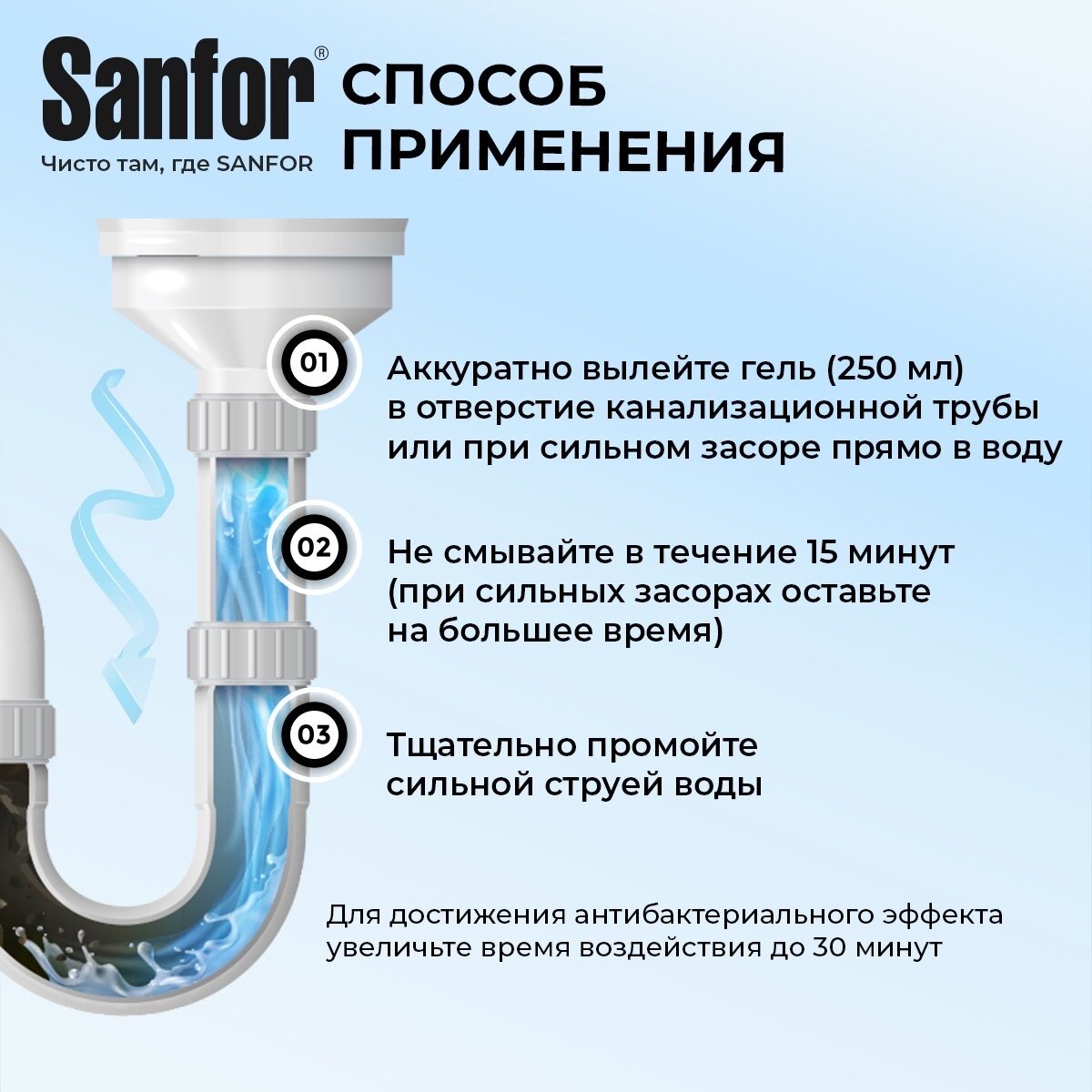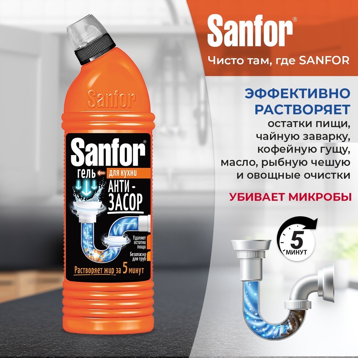 Гель для прочистки труб SANFOR Антизасор 750мл 5 мин. для кухни